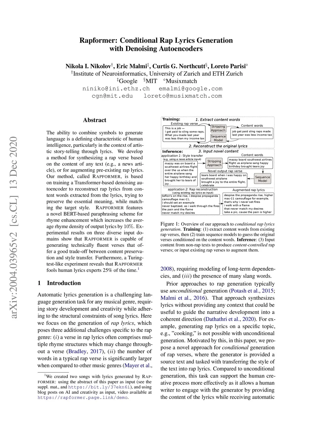 The ability to combine symbols to generate language is a defining characteristic of human intelligence, particularly in the context of artistic story-telling through lyrics. We develop a method for synthesizing a rap verse based on the content of any text (e.g., a news article), or for augmenting pre-existing rap lyrics. Our method, called Rapformer, is based on training a Transformer-based denoising autoencoder to reconstruct rap lyrics from content words extracted from the lyrics, trying to preserve the essential meaning, while matching the target style. Rapformer features a novel BERT-based paraphrasing scheme for rhyme enhancement which increases the average rhyme density of output lyrics by 10%. Experimental results on three diverse input domains show that Rapformer is capable of generating technically fluent verses that offer a good trade-off between content preservation and style transfer. Furthermore, a Turing-test-like experiment reveals that Rapformer fools human lyrics experts 25% of the time.
