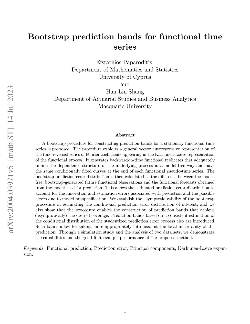 A bootstrap procedure for constructing prediction bands for a stationary functional time series is proposed. The procedure exploits a general vector autoregressive representation of the time-reversed series of Fourier coefficients appearing in the Karhunen-Loeve representation of the functional process. It generates backward-in-time, functional replicates that adequately mimic the dependence structure of the underlying process in a model-free way and have the same conditionally fixed curves at the end of each functional pseudo-time series. The bootstrap prediction error distribution is then calculated as the difference between the model-free, bootstrap-generated future functional observations and the functional forecasts obtained from the model used for prediction. This allows the estimated prediction error distribution to account for the innovation and estimation errors associated with prediction and the possible errors due to model misspecification. We establish the asymptotic validity of the bootstrap procedure in estimating the conditional prediction error distribution of interest, and we also show that the procedure enables the construction of prediction bands that achieve (asymptotically) the desired coverage. Prediction bands based on a consistent estimation of the conditional distribution of the studentized prediction error process also are introduced. Such bands allow for taking more appropriately into account the local uncertainty of prediction. Through a simulation study and the analysis of two data sets, we demonstrate the capabilities and the good finite-sample performance of the proposed method.