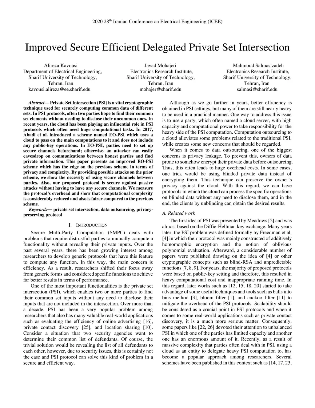 Private Set Intersection (PSI) is a vital cryptographic technique used for securely computing common data of different sets. In PSI protocols, often two parties hope to find their common set elements without needing to disclose their uncommon ones. In recent years, the cloud has been playing an influential role in PSI protocols which often need huge computational tasks. In 2017, Abadi et al. introduced a scheme named EO-PSI which uses a cloud to pass on the main computations to it and does not include any public-key operations. In EO-PSI, parties need to set up secure channels beforehand; otherwise, an attacker can easily eavesdrop on communications between honest parties and find private information. This paper presents an improved EO-PSI scheme which has the edge on the previous scheme in terms of privacy and complexity. By providing possible attacks on the prior scheme, we show the necessity of using secure channels between parties. Also, our proposed protocol is secure against passive attacks without having to have any secure channels. We measure the protocol's overhead and show that computational complexity is considerably reduced and also is fairer compared to the previous scheme.