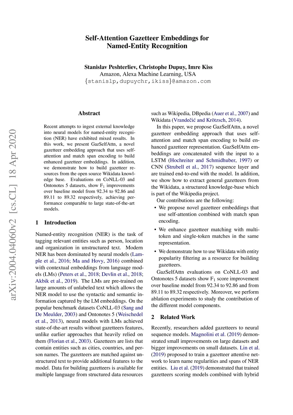 Self-Attention Gazetteer Embeddings for Named-Entity Recognition