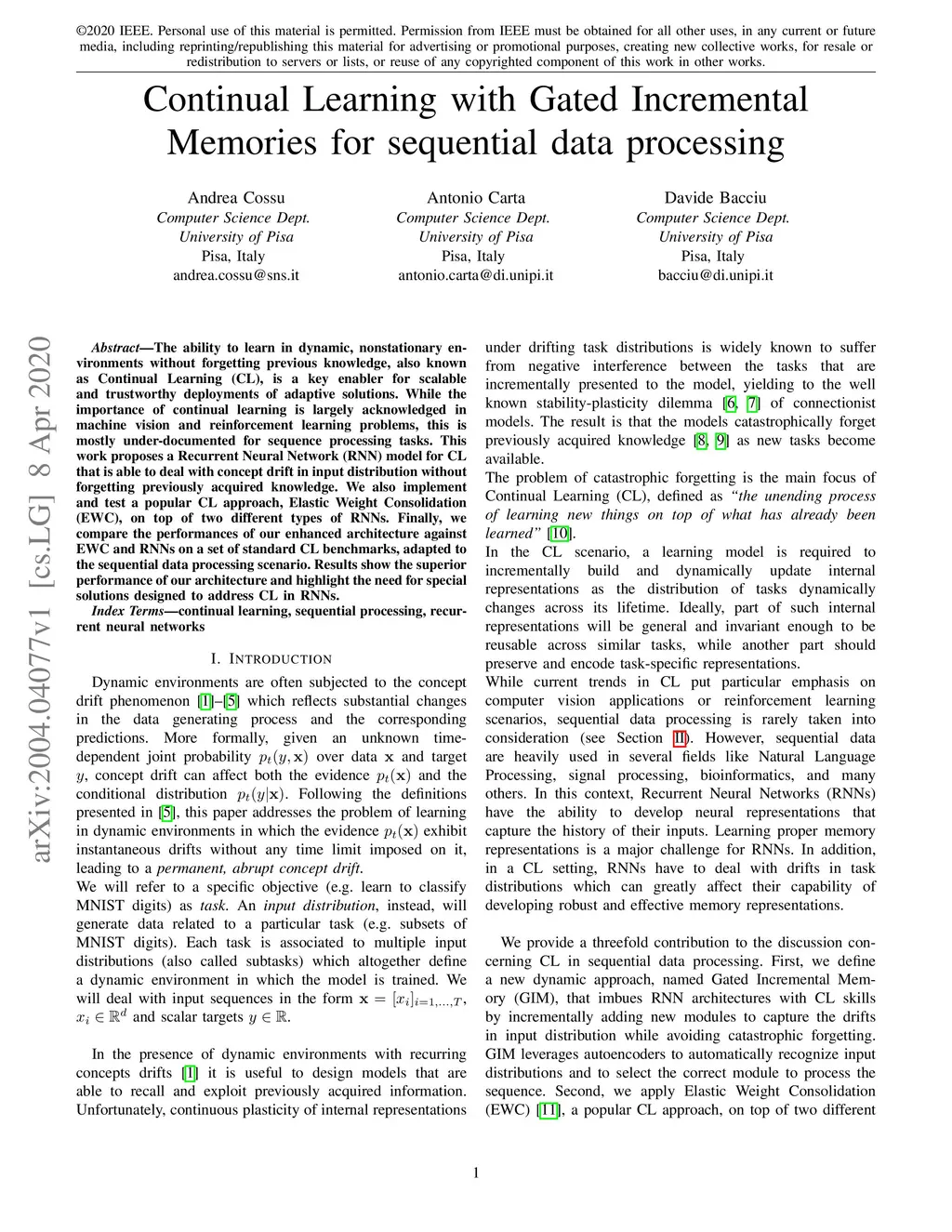 Continual Learning with Gated Incremental Memories for sequential data