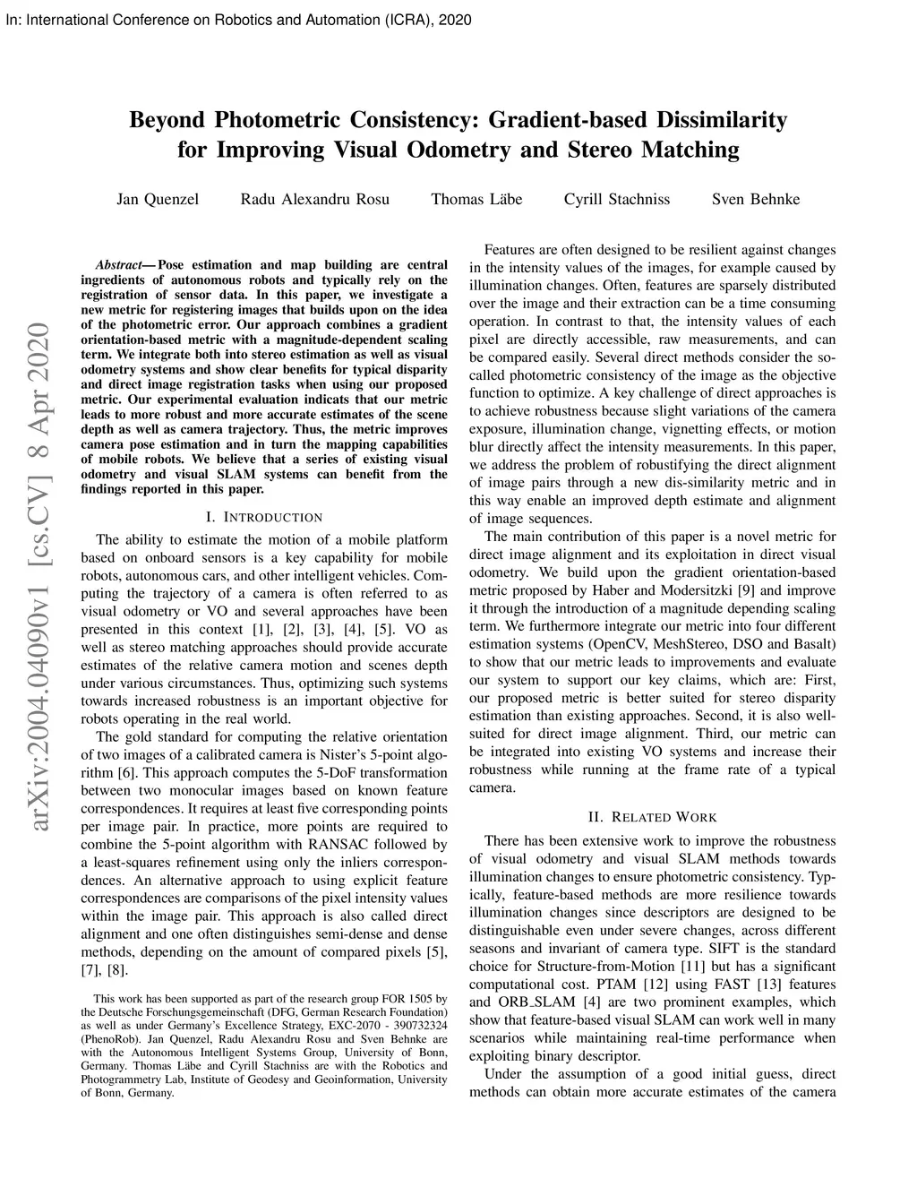 Pose estimation and map building are central ingredients of autonomous robots and typically rely on the registration of sensor data. In this paper, we investigate a new metric for registering images that builds upon on the idea of the photometric error. Our approach combines a gradient orientation-based metric with a magnitude-dependent scaling term. We integrate both into stereo estimation as well as visual odometry systems and show clear benefits for typical disparity and direct image registration tasks when using our proposed metric. Our experimental evaluation indicats that our metric leads to more robust and more accurate estimates of the scene depth as well as camera trajectory. Thus, the metric improves camera pose estimation and in turn the mapping capabilities of mobile robots. We believe that a series of existing visual odometry and visual SLAM systems can benefit from the findings reported in this paper.