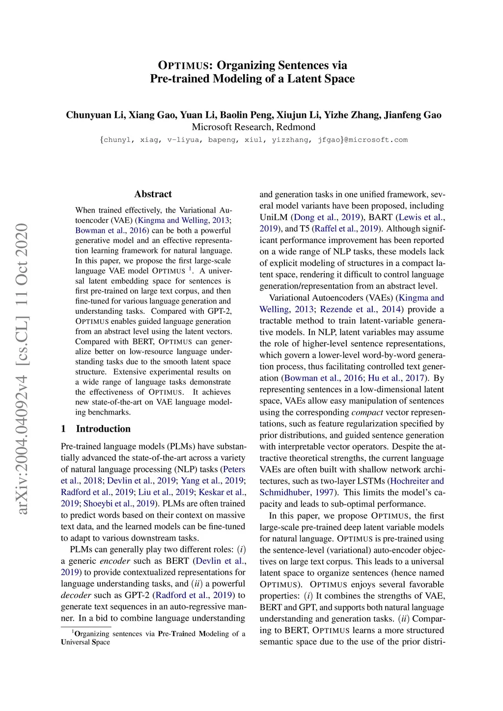 When trained effectively, the Variational Autoencoder (VAE) can be both a powerful generative model and an effective representation learning framework for natural language. In this paper, we propose the first large-scale language VAE model, Optimus. A universal latent embedding space for sentences is first pre-trained on large text corpus, and then fine-tuned for various language generation and understanding tasks. Compared with GPT-2, Optimus enables guided language generation from an abstract level using the latent vectors. Compared with BERT, Optimus can generalize better on low-resource language understanding tasks due to the smooth latent space structure. Extensive experimental results on a wide range of language tasks demonstrate the effectiveness of Optimus. It achieves new state-of-the-art on VAE language modeling benchmarks. We hope that our first pre-trained big VAE language model itself and results can help the NLP community renew the interests of deep generative models in the era of large-scale pre-training, and make these principled methods more practical.