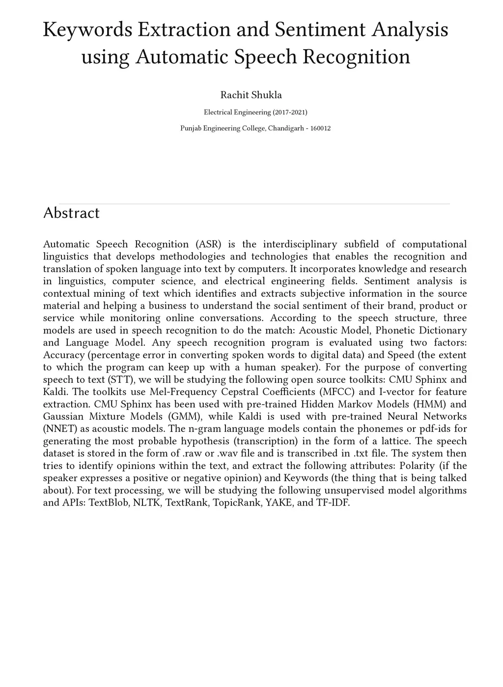 Automatic Speech Recognition (ASR) is the interdisciplinary subfield of computational linguistics that develops methodologies and technologies that enables the recognition and translation of spoken language into text by computers. It incorporates knowledge and research in linguistics, computer science, and electrical engineering fields. Sentiment analysis is contextual mining of text which identifies and extracts subjective information in the source material and helping a business to understand the social sentiment of their brand, product or service while monitoring online conversations. According to the speech structure, three models are used in speech recognition to do the match: Acoustic Model, Phonetic Dictionary and Language Model. Any speech recognition program is evaluated using two factors: Accuracy (percentage error in converting spoken words to digital data) and Speed (the extent to which the program can keep up with a human speaker). For the purpose of converting speech to text (STT), we will be studying the following open source toolkits: CMU Sphinx and Kaldi. The toolkits use Mel-Frequency Cepstral Coefficients (MFCC) and I-vector for feature extraction. CMU Sphinx has been used with pre-trained Hidden Markov Models (HMM) and Gaussian Mixture Models (GMM), while Kaldi is used with pre-trained Neural Networks (NNET) as acoustic models. The n-gram language models contain the phonemes or pdf-ids for generating the most probable hypothesis (transcription) in the form of a lattice. The speech dataset is stored in the form of .raw or .wav file and is transcribed in .txt file. The system then tries to identify opinions within the text, and extract the following attributes: Polarity (if the speaker expresses a positive or negative opinion) and Keywords (the thing that is being talked about).