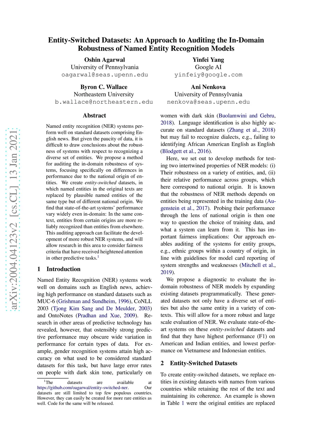 Named entity recognition systems perform well on standard datasets comprising English news. But given the paucity of data, it is difficult to draw conclusions about the robustness of systems with respect to recognizing a diverse set of entities. We propose a method for auditing the in-domain robustness of systems, focusing specifically on differences in performance due to the national origin of entities. We create entity-switched datasets, in which named entities in the original texts are replaced by plausible named entities of the same type but of different national origin. We find that state-of-the-art systems' performance vary widely even in-domain: In the same context, entities from certain origins are more reliably recognized than entities from elsewhere. Systems perform best on American and Indian entities, and worst on Vietnamese and Indonesian entities. This auditing approach can facilitate the development of more robust named entity recognition systems, and will allow research in this area to consider fairness criteria that have received heightened attention in other predictive technology work.