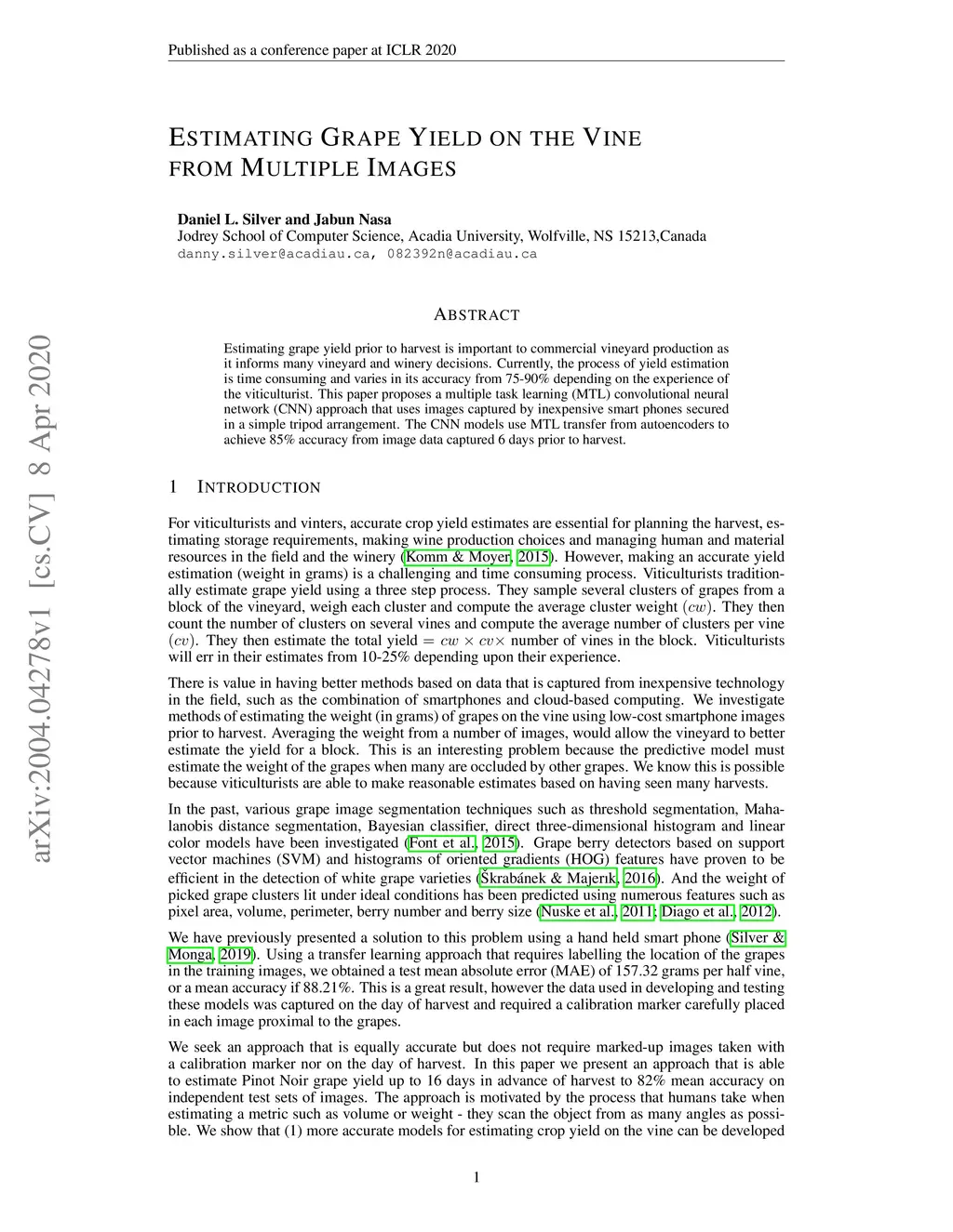 Estimating grape yield prior to harvest is important to commercial vineyard production as it informs many vineyard and winery decisions. Currently, the process of yield estimation is time consuming and varies in its accuracy from 75-90\% depending on the experience of the viticulturist. This paper proposes a multiple task learning (MTL) convolutional neural network (CNN) approach that uses images captured by inexpensive smart phones secured in a simple tripod arrangement. The CNN models use MTL transfer from autoencoders to achieve 85\% accuracy from image data captured 6 days prior to harvest.