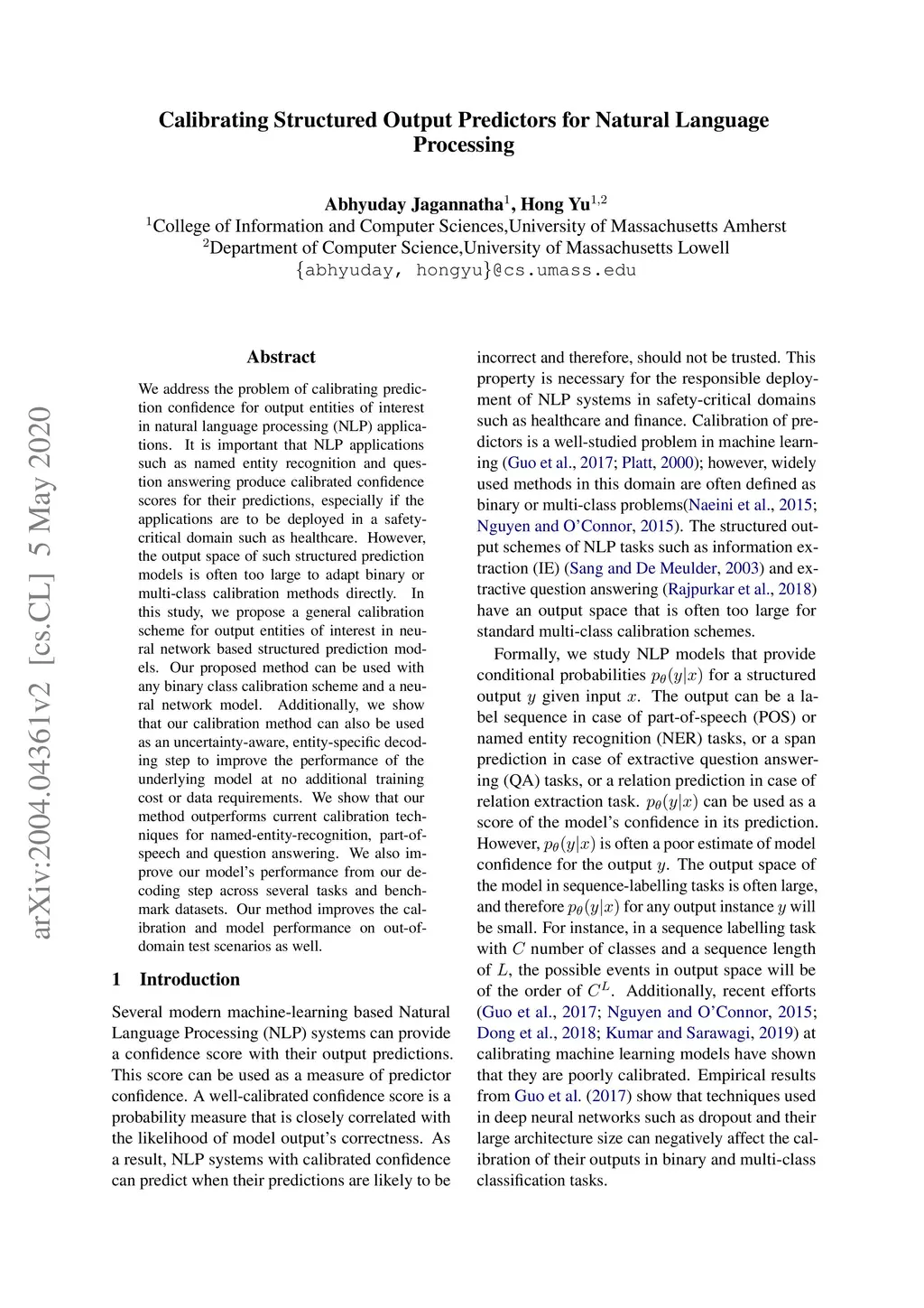 We address the problem of calibrating prediction confidence for output entities of interest in natural language processing (NLP) applications. It is important that NLP applications such as named entity recognition and question answering produce calibrated confidence scores for their predictions, especially if the system is to be deployed in a safety-critical domain such as healthcare. However, the output space of such structured prediction models is often too large to adapt binary or multi-class calibration methods directly. In this study, we propose a general calibration scheme for output entities of interest in neural-network based structured prediction models. Our proposed method can be used with any binary class calibration scheme and a neural network model. Additionally, we show that our calibration method can also be used as an uncertainty-aware, entity-specific decoding step to improve the performance of the underlying model at no additional training cost or data requirements. We show that our method outperforms current calibration techniques for named-entity-recognition, part-of-speech and question answering. We also improve our model's performance from our decoding step across several tasks and benchmark datasets. Our method improves the calibration and model performance on out-of-domain test scenarios as well.