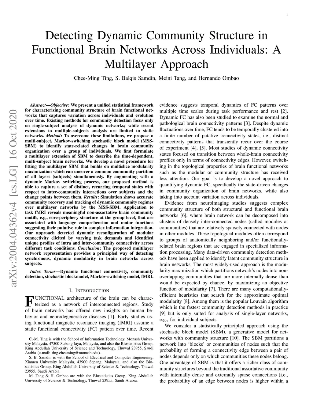 We present a unified statistical framework for characterizing community structure of brain functional networks that captures variation across individuals and evolution over time. Existing methods for community detection focus only on single-subject analysis of dynamic networks; while recent extensions to multiple-subjects analysis are limited to static networks. To overcome these limitations, we propose a multi-subject, Markov-switching stochastic block model (MSS-SBM) to identify state-related changes in brain community organization over a group of individuals. We first formulate a multilayer extension of SBM to describe the time-dependent, multi-subject brain networks. We develop a novel procedure for fitting the multilayer SBM that builds on multislice modularity maximization which can uncover a common community partition of all layers (subjects) simultaneously. By augmenting with a dynamic Markov switching process, our proposed method is able to capture a set of distinct, recurring temporal states with respect to inter-community interactions over subjects and the change points between them. Simulation shows accurate community recovery and tracking of dynamic community regimes over multilayer networks by the MSS-SBM. Application to task fMRI reveals meaningful non-assortative brain community motifs, e.g., core-periphery structure at the group level, that are associated with language comprehension and motor functions suggesting their putative role in complex information integration. Our approach detected dynamic reconfiguration of modular connectivity elicited by varying task demands and identified unique profiles of intra and inter-community connectivity across different task conditions. The proposed multilayer network representation provides a principled way of detecting synchronous, dynamic modularity in brain networks across subjects.
