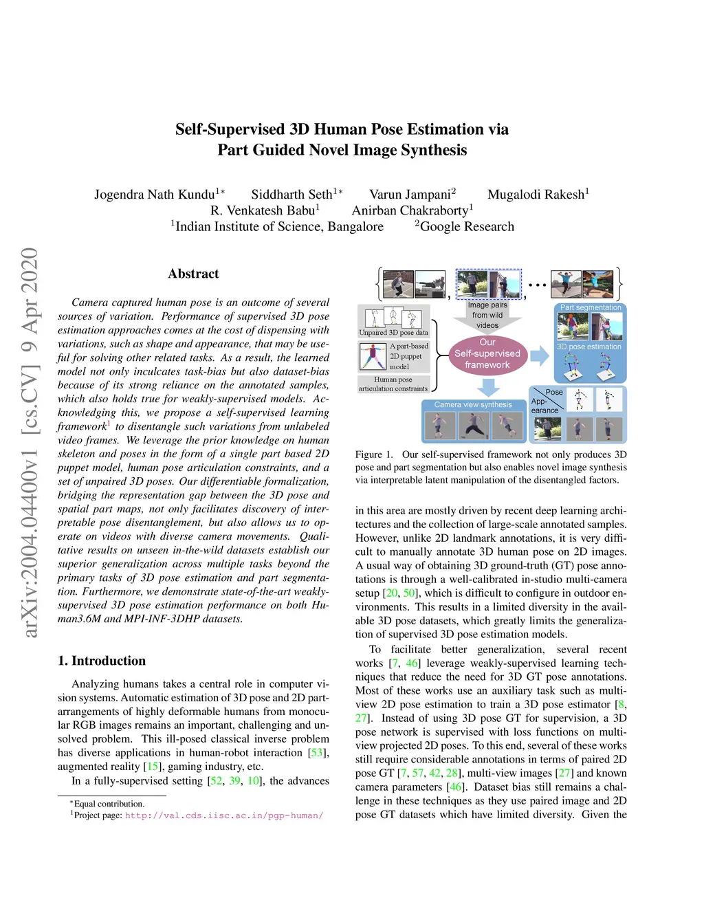 Self-Supervised 3D Human Pose Estimation via Part Guided Novel Image
