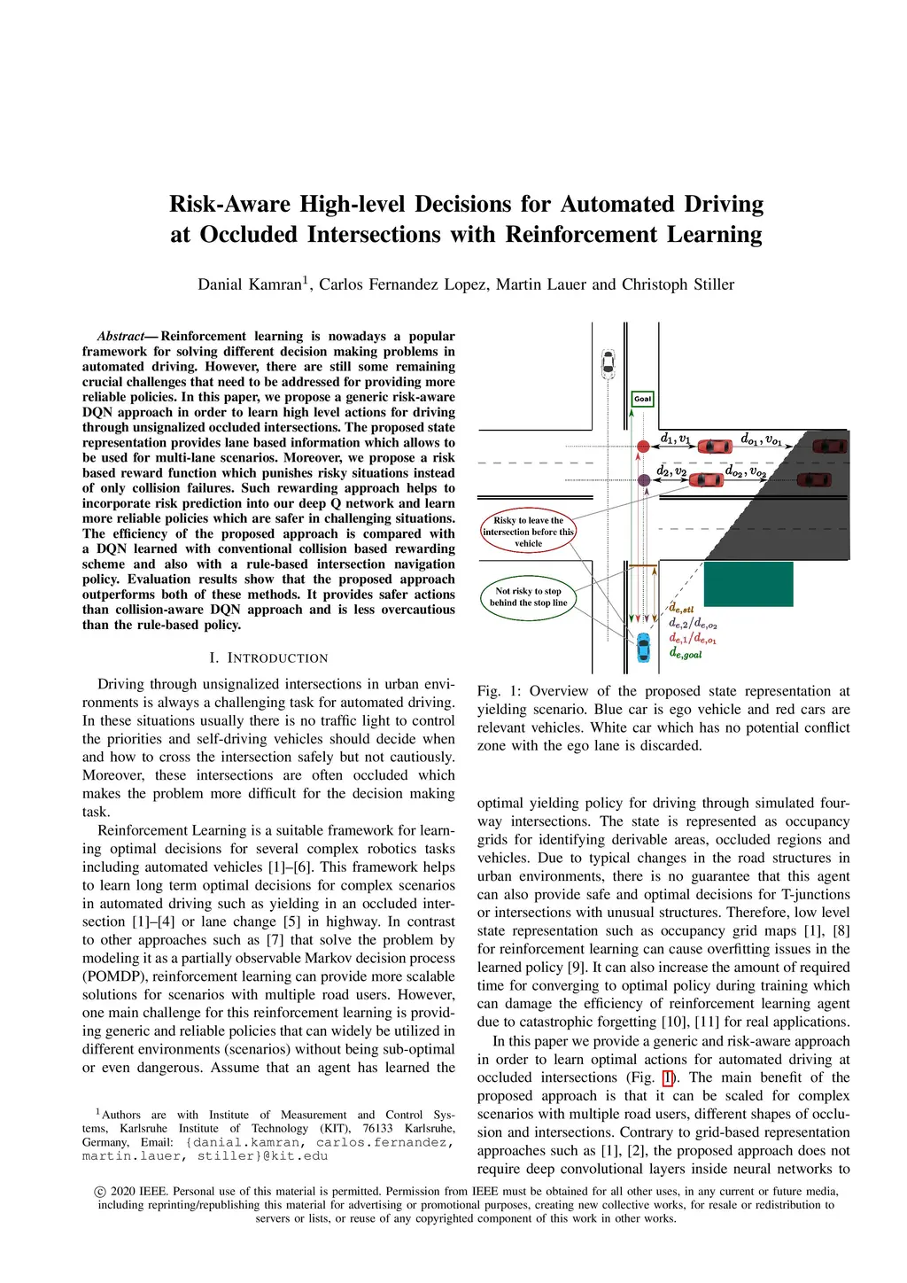 Reinforcement learning is nowadays a popular framework for solving different decision making problems in automated driving. However, there are still some remaining crucial challenges that need to be addressed for providing more reliable policies. In this paper, we propose a generic risk-aware DQN approach in order to learn high level actions for driving through unsignalized occluded intersections. The proposed state representation provides lane based information which allows to be used for multi-lane scenarios. Moreover, we propose a risk based reward function which punishes risky situations instead of only collision failures. Such rewarding approach helps to incorporate risk prediction into our deep Q network and learn more reliable policies which are safer in challenging situations. The efficiency of the proposed approach is compared with a DQN learned with conventional collision based rewarding scheme and also with a rule-based intersection navigation policy. Evaluation results show that the proposed approach outperforms both of these methods. It provides safer actions than collision-aware DQN approach and is less overcautious than the rule-based policy.