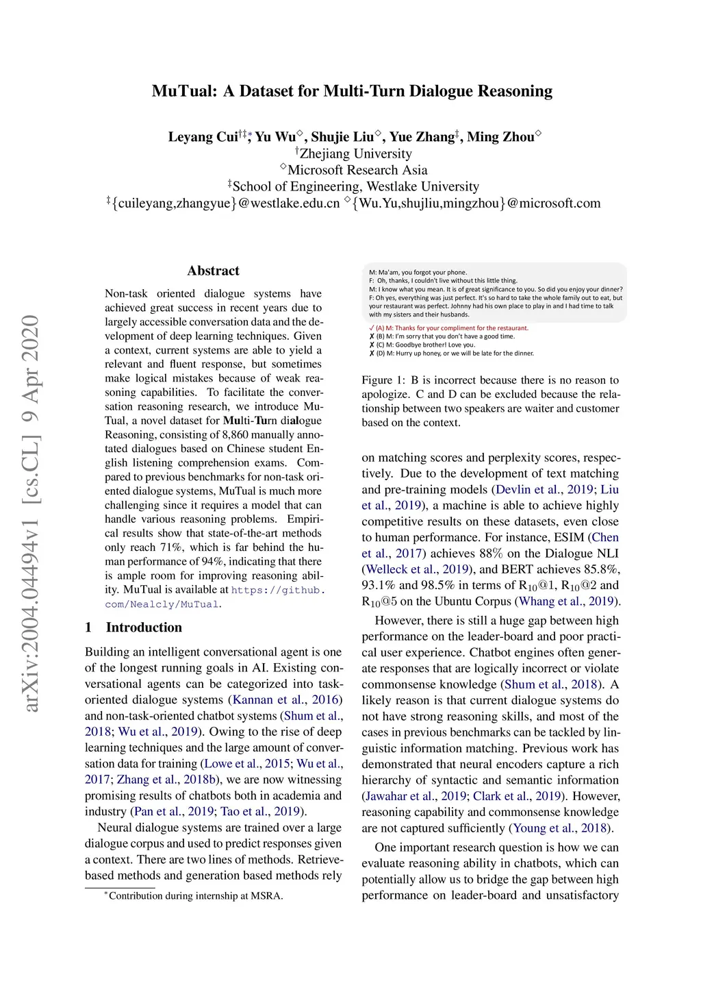 MuTual: A Dataset for Multi-Turn Dialogue Reasoning