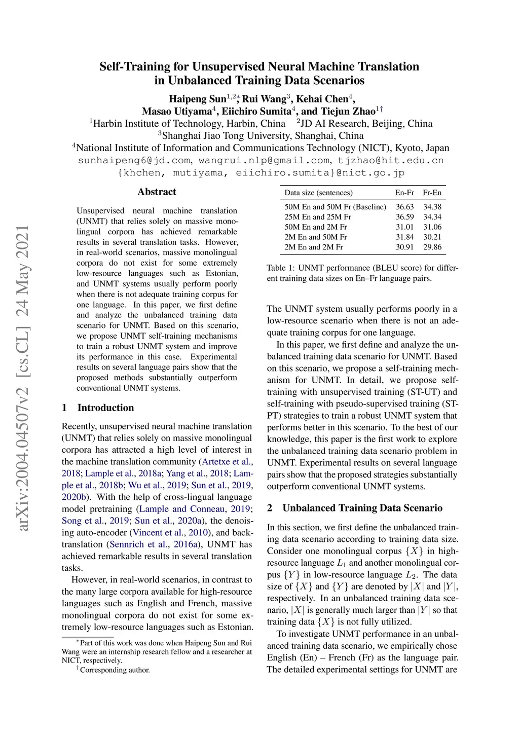 Self-Training for Unsupervised Neural Machine Translation in Unbalanced