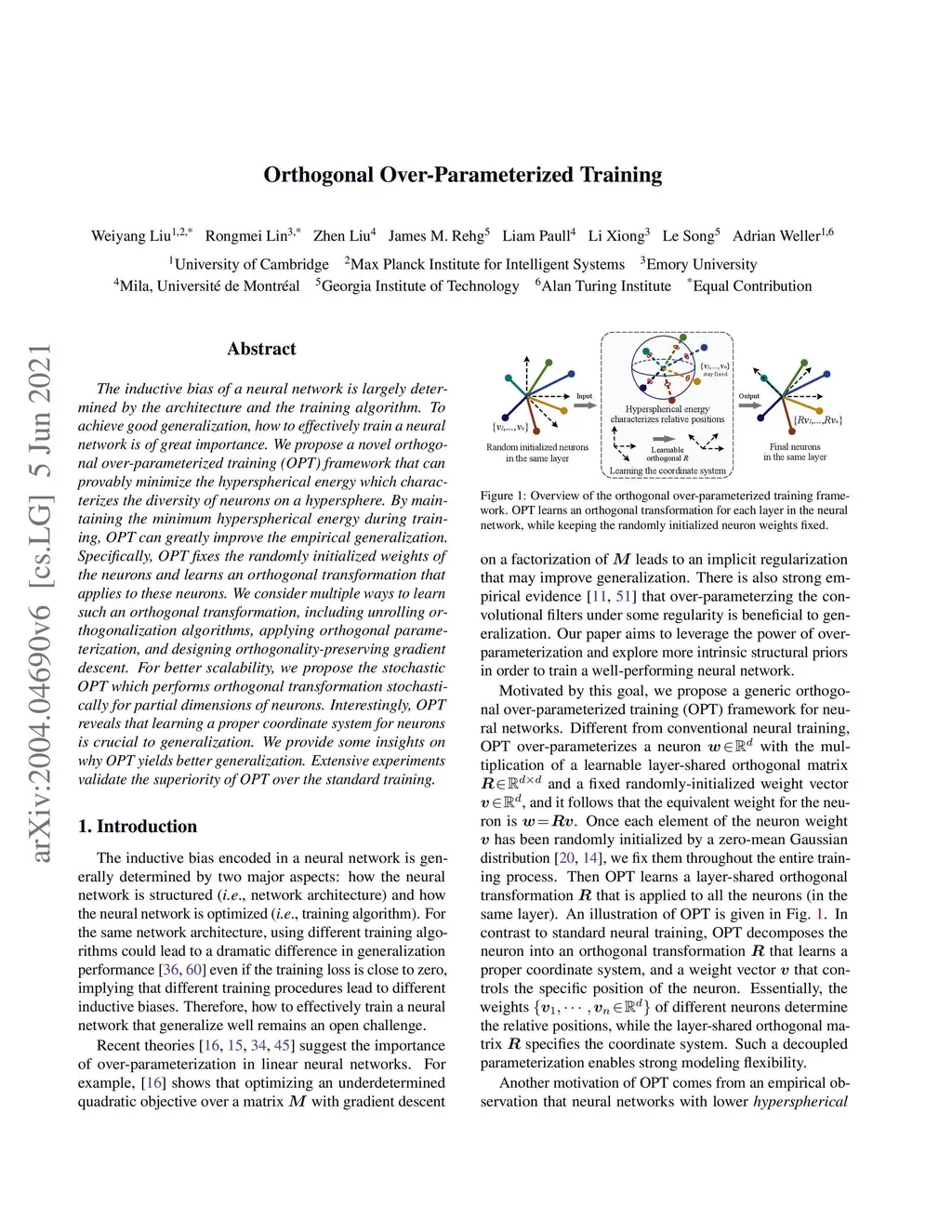 The inductive bias of a neural network is largely determined by the architecture and the training algorithm. To achieve good generalization, how to effectively train a neural network is of great importance. We propose a novel orthogonal over-parameterized training (OPT) framework that can provably minimize the hyperspherical energy which characterizes the diversity of neurons on a hypersphere. By maintaining the minimum hyperspherical energy during training, OPT can greatly improve the empirical generalization. Specifically, OPT fixes the randomly initialized weights of the neurons and learns an orthogonal transformation that applies to these neurons. We consider multiple ways to learn such an orthogonal transformation, including unrolling orthogonalization algorithms, applying orthogonal parameterization, and designing orthogonality-preserving gradient descent. For better scalability, we propose the stochastic OPT which performs orthogonal transformation stochastically for partial dimensions of neurons. Interestingly, OPT reveals that learning a proper coordinate system for neurons is crucial to generalization. We provide some insights on why OPT yields better generalization. Extensive experiments validate the superiority of OPT over the standard training.