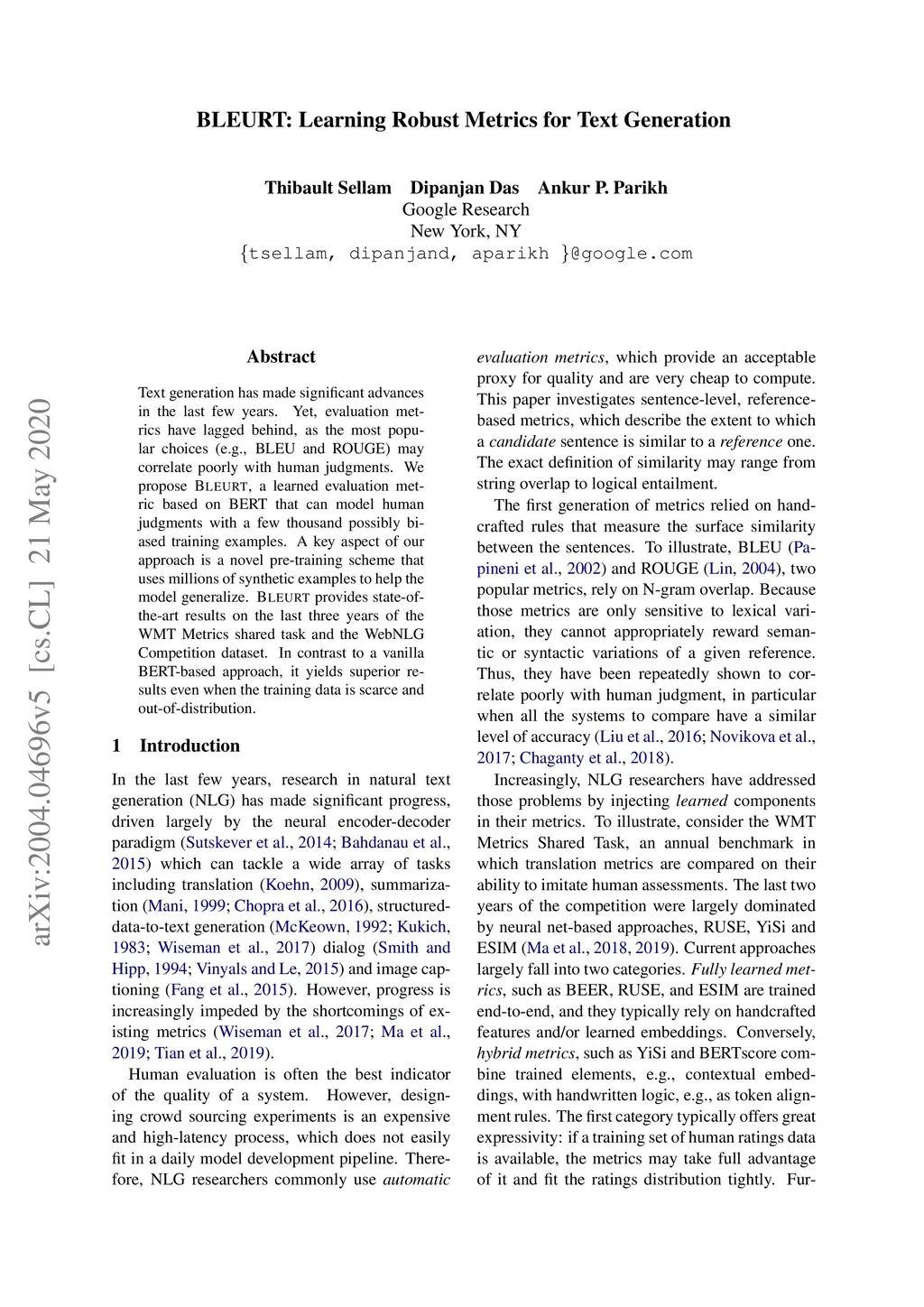 BLEURT: Learning Robust Metrics for Text Generation