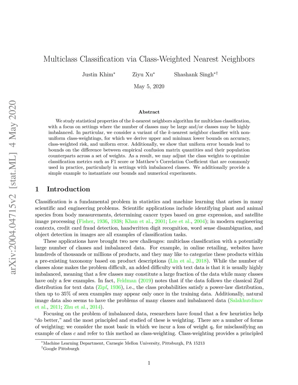 We study statistical properties of the k-nearest neighbors algorithm for multiclass classification, with a focus on settings where the number of classes may be large and/or classes may be highly imbalanced. In particular, we consider a variant of the k-nearest neighbor classifier with non-uniform class-weightings, for which we derive upper and minimax lower bounds on accuracy, class-weighted risk, and uniform error. Additionally, we show that uniform error bounds lead to bounds on the difference between empirical confusion matrix quantities and their population counterparts across a set of weights. As a result, we may adjust the class weights to optimize classification metrics such as F1 score or Matthew's Correlation Coefficient that are commonly used in practice, particularly in settings with imbalanced classes. We additionally provide a simple example to instantiate our bounds and numerical experiments.