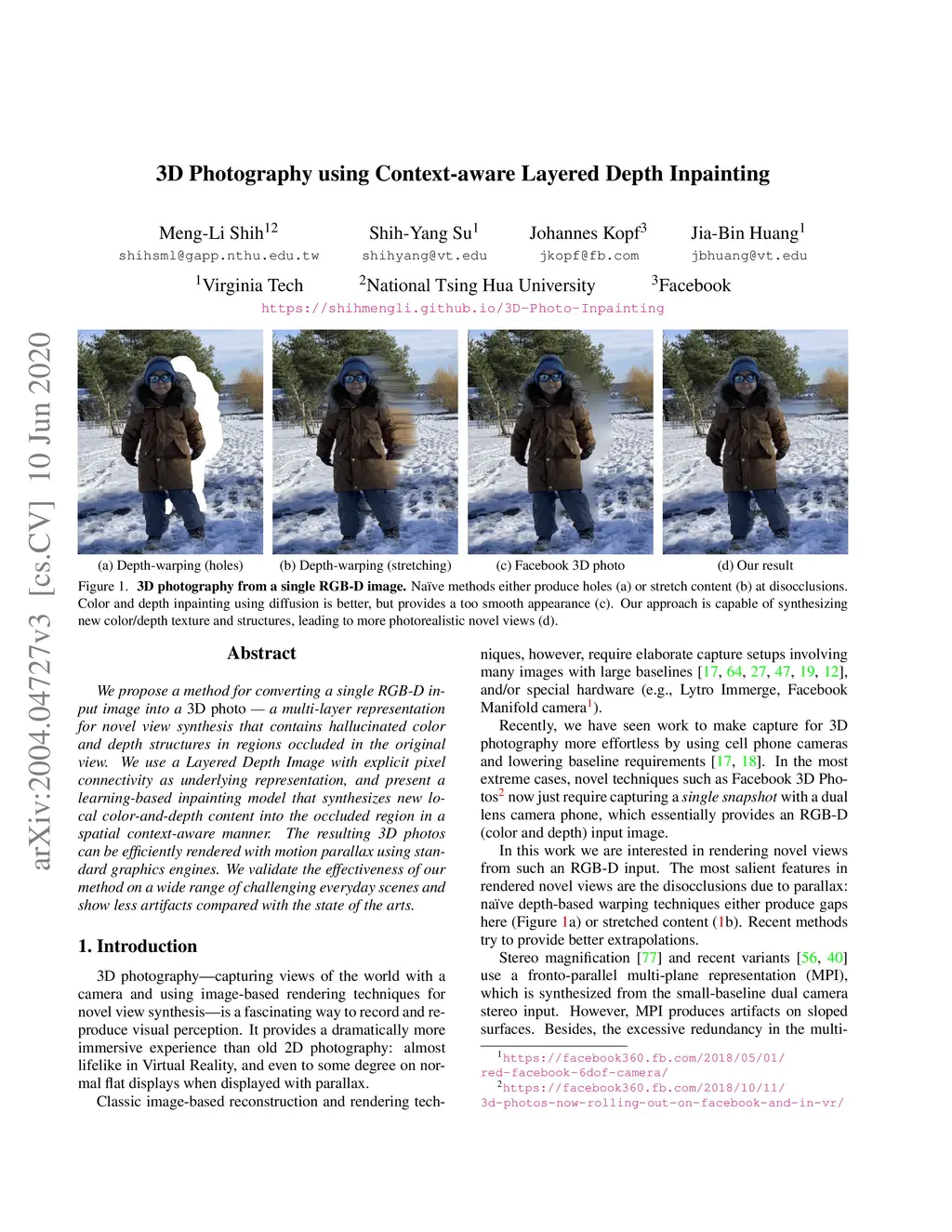 We propose a method for converting a single RGB-D input image into a 3D photo - a multi-layer representation for novel view synthesis that contains hallucinated color and depth structures in regions occluded in the original view. We use a Layered Depth Image with explicit pixel connectivity as underlying representation, and present a learning-based inpainting model that synthesizes new local color-and-depth content into the occluded region in a spatial context-aware manner. The resulting 3D photos can be efficiently rendered with motion parallax using standard graphics engines. We validate the effectiveness of our method on a wide range of challenging everyday scenes and show fewer artifacts compared with the state of the arts.
