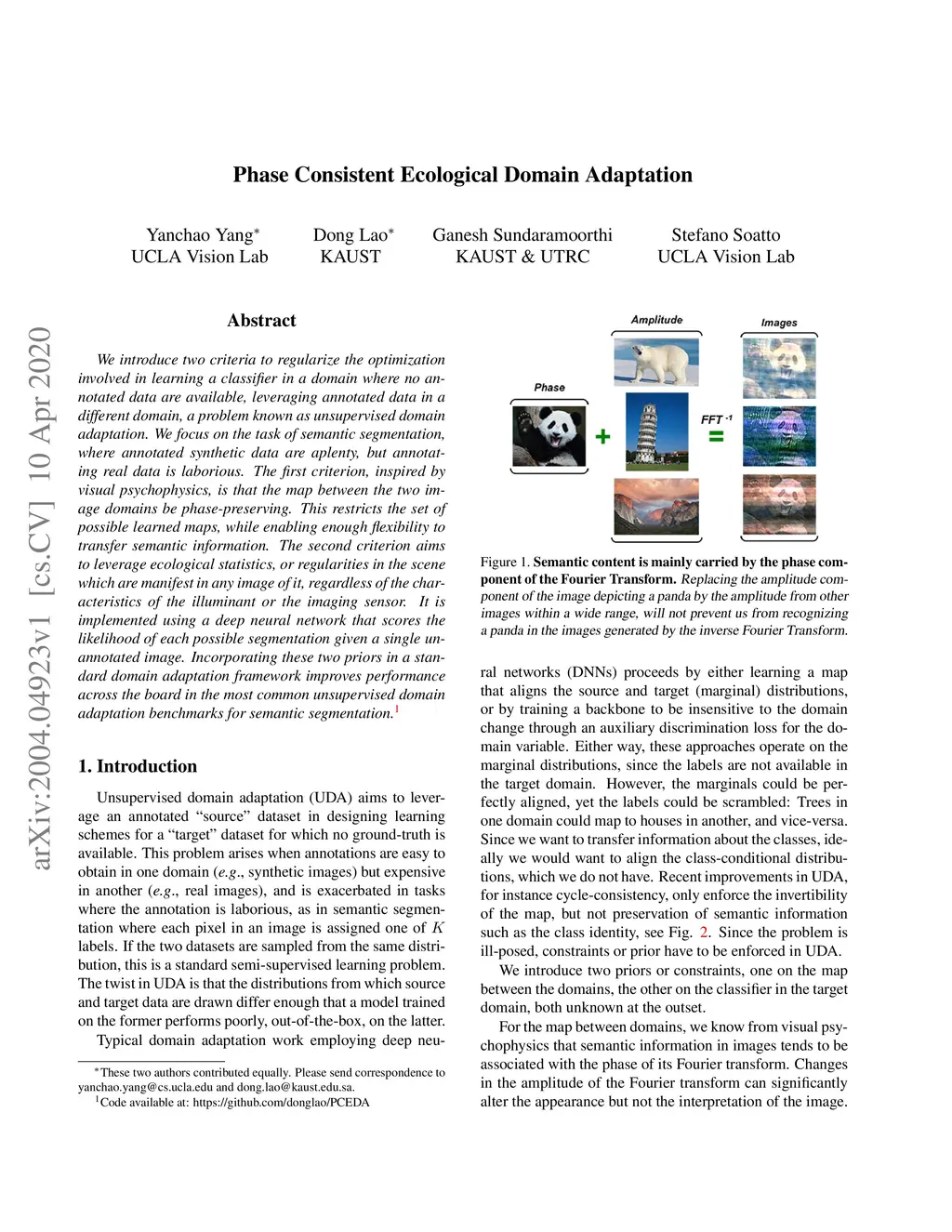 We introduce two criteria to regularize the optimization involved in learning a classifier in a domain where no annotated data are available, leveraging annotated data in a different domain, a problem known as unsupervised domain adaptation. We focus on the task of semantic segmentation, where annotated synthetic data are aplenty, but annotating real data is laborious. The first criterion, inspired by visual psychophysics, is that the map between the two image domains be phase-preserving. This restricts the set of possible learned maps, while enabling enough flexibility to transfer semantic information. The second criterion aims to leverage ecological statistics, or regularities in the scene which are manifest in any image of it, regardless of the characteristics of the illuminant or the imaging sensor. It is implemented using a deep neural network that scores the likelihood of each possible segmentation given a single un-annotated image. Incorporating these two priors in a standard domain adaptation framework improves performance across the board in the most common unsupervised domain adaptation benchmarks for semantic segmentation.