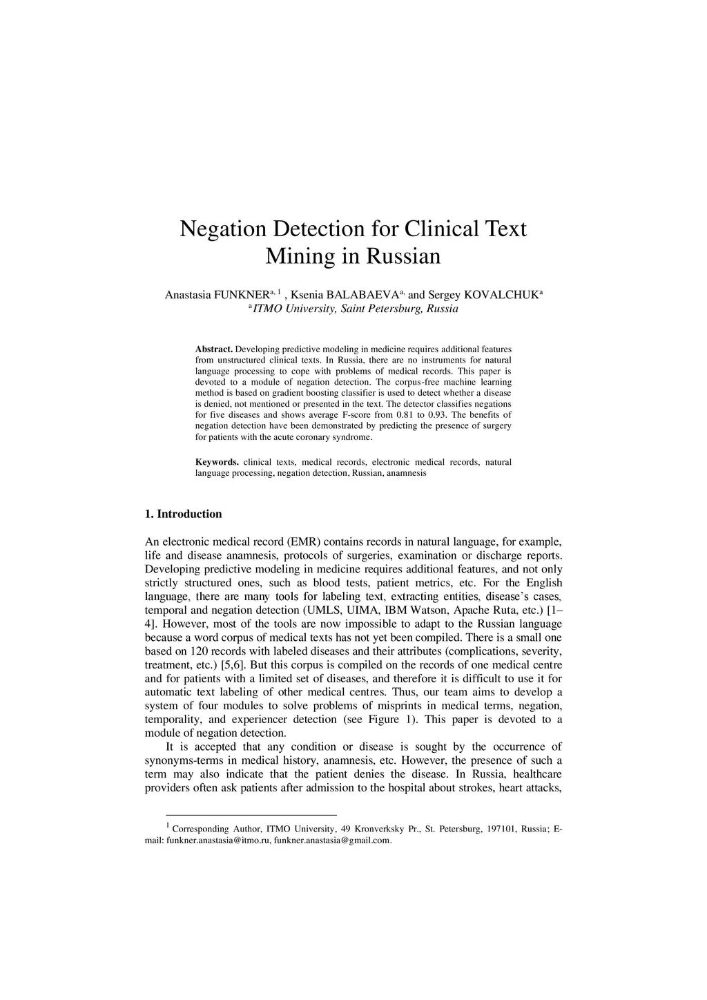 Developing predictive modeling in medicine requires additional features from unstructured clinical texts. In Russia, there are no instruments for natural language processing to cope with problems of medical records. This paper is devoted to a module of negation detection. The corpus-free machine learning method is based on gradient boosting classifier is used to detect whether a disease is denied, not mentioned or presented in the text. The detector classifies negations for five diseases and shows average F-score from 0.81 to 0.93. The benefits of negation detection have been demonstrated by predicting the presence of surgery for patients with the acute coronary syndrome.