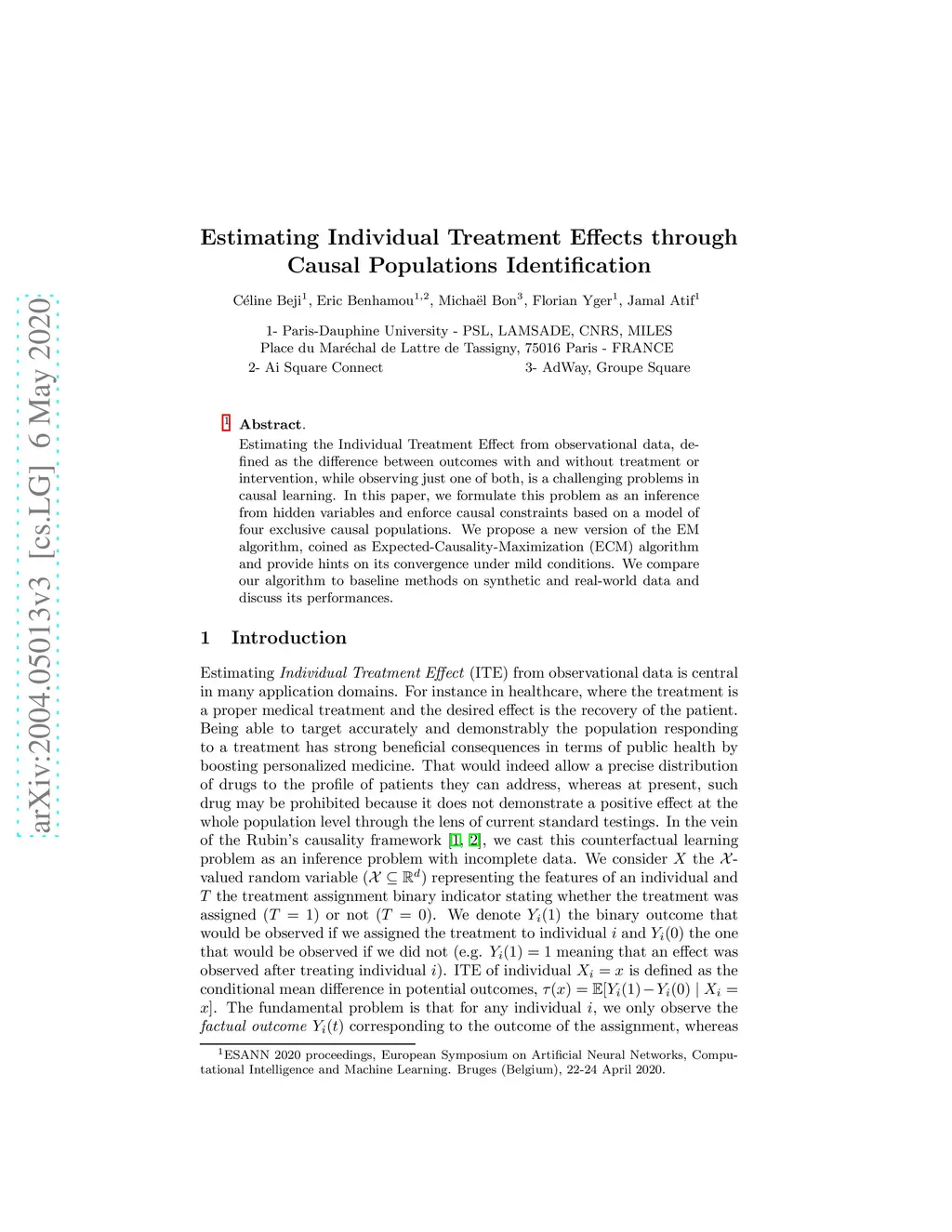 Estimating the Individual Treatment Effect from observational data, defined as the difference between outcomes with and without treatment or intervention, while observing just one of both, is a challenging problems in causal learning. In this paper, we formulate this problem as an inference from hidden variables and enforce causal constraints based on a model of four exclusive causal populations. We propose a new version of the EM algorithm, coined as Expected-Causality-Maximization (ECM) algorithm and provide hints on its convergence under mild conditions. We compare our algorithm to baseline methods on synthetic and real-world data and discuss its performances.