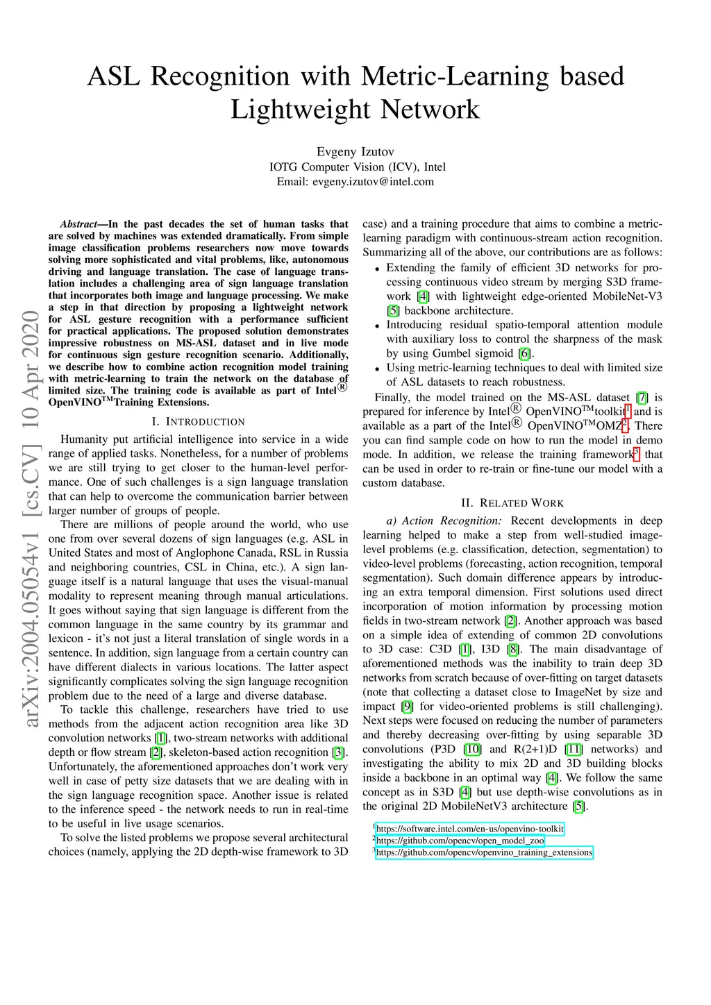 In the past decades the set of human tasks that are solved by machines was extended dramatically. From simple image classification problems researchers now move towards solving more sophisticated and vital problems, like, autonomous driving and language translation. The case of language translation includes a challenging area of sign language translation that incorporates both image and language processing. We make a step in that direction by proposing a lightweight network for ASL gesture recognition with a performance sufficient for practical applications. The proposed solution demonstrates impressive robustness on MS-ASL dataset and in live mode for continuous sign gesture recognition scenario. Additionally, we describe how to combine action recognition model training with metric-learning to train the network on the database of limited size. The training code is available as part of Intel OpenVINO Training Extensions.