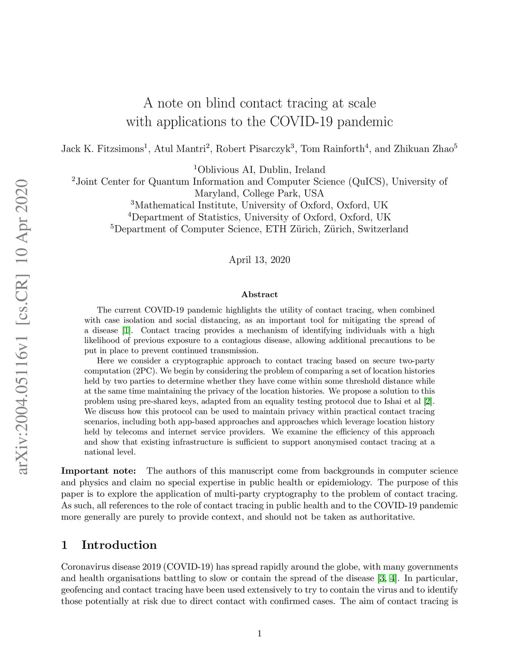 The current COVID-19 pandemic highlights the utility of contact tracing, when combined with case isolation and social distancing, as an important tool for mitigating the spread of a disease [1]. Contact tracing provides a mechanism of identifying individuals with a high likelihood of previous exposure to a contagious disease, allowing additional precautions to be put in place to prevent continued transmission. Here we consider a cryptographic approach to contact tracing based on secure two-party computation (2PC). We begin by considering the problem of comparing a set of location histories held by two parties to determine whether they have come within some threshold distance while at the same time maintaining the privacy of the location histories. We propose a solution to this problem using pre-shared keys, adapted from an equality testing protocol due to Ishai et al [2]. We discuss how this protocol can be used to maintain privacy within practical contact tracing scenarios, including both app-based approaches and approaches which leverage location history held by telecoms and internet service providers. We examine the efficiency of this approach and show that existing infrastructure is sufficient to support anonymised contact tracing at a national level.