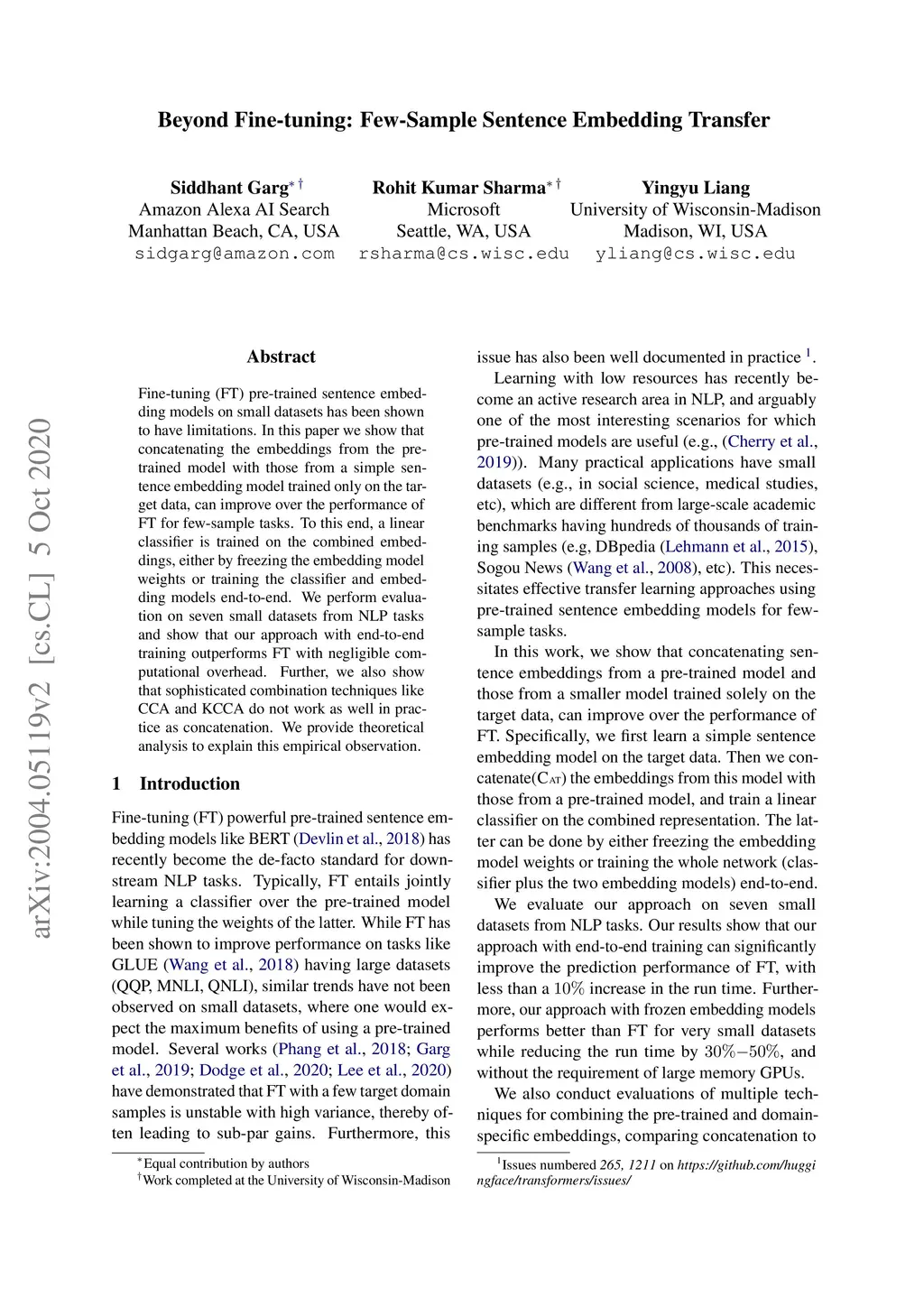 Fine-tuning (FT) pre-trained sentence embedding models on small datasets has been shown to have limitations. In this paper we show that concatenating the embeddings from the pre-trained model with those from a simple sentence embedding model trained only on the target data, can improve over the performance of FT for few-sample tasks. To this end, a linear classifier is trained on the combined embeddings, either by freezing the embedding model weights or training the classifier and embedding models end-to-end. We perform evaluation on seven small datasets from NLP tasks and show that our approach with end-to-end training outperforms FT with negligible computational overhead. Further, we also show that sophisticated combination techniques like CCA and KCCA do not work as well in practice as concatenation. We provide theoretical analysis to explain this empirical observation.