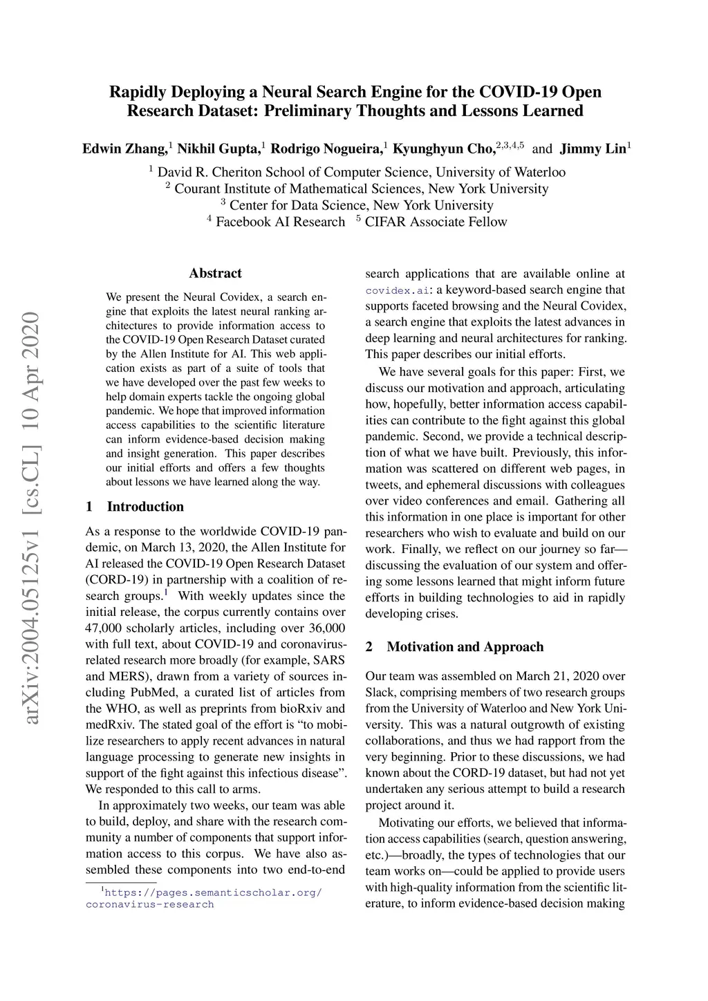 We present the Neural Covidex, a search engine that exploits the latest neural ranking architectures to provide information access to the COVID-19 Open Research Dataset curated by the Allen Institute for AI. This web application exists as part of a suite of tools that we have developed over the past few weeks to help domain experts tackle the ongoing global pandemic. We hope that improved information access capabilities to the scientific literature can inform evidence-based decision making and insight generation. This paper describes our initial efforts and offers a few thoughts about lessons we have learned along the way.