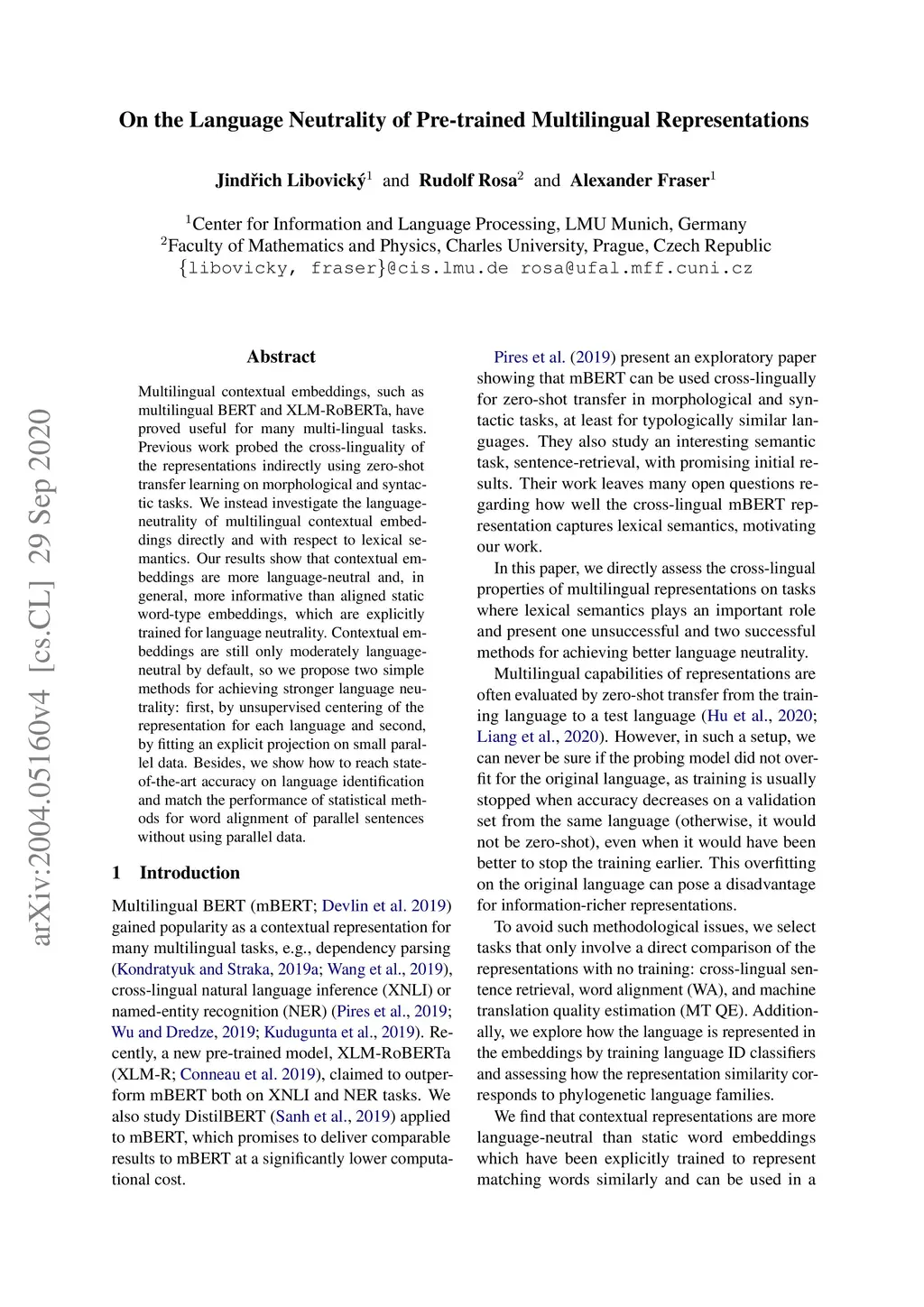 Multilingual contextual embeddings, such as multilingual BERT (mBERT) and XLM-RoBERTa, have proved useful for many multi-lingual tasks. Previous work probed the cross-linguality of the representations indirectly using zero-shot transfer learning on morphological and syntactic tasks. We instead focus on the language-neutrality of mBERT with respect to lexical semantics. Our results show that contextual embeddings are more language-neutral and in general more informative than aligned static word-type embeddings which are explicitly trained for language neutrality. Contextual embeddings are still by default only moderately language-neutral, however, we show two simple methods for achieving stronger language neutrality: first, by unsupervised centering of the representation for languages, and second by fitting an explicit projection on small parallel data. In addition, we show how to reach state-of-the-art accuracy on language identification and word alignment in parallel sentences.