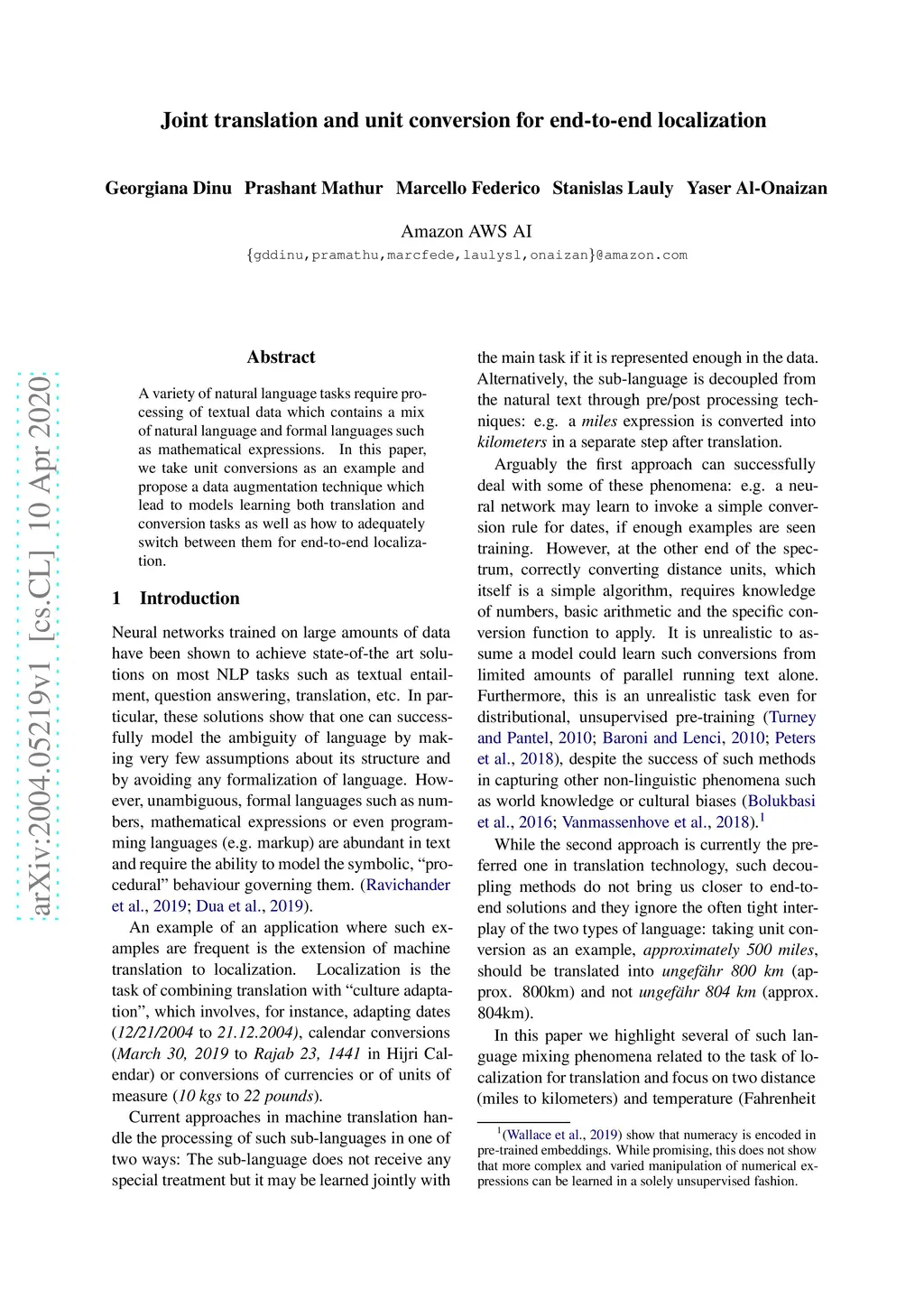 A variety of natural language tasks require processing of textual data which contains a mix of natural language and formal languages such as mathematical expressions. In this paper, we take unit conversions as an example and propose a data augmentation technique which leads to models learning both translation and conversion tasks as well as how to adequately switch between them for end-to-end localization.