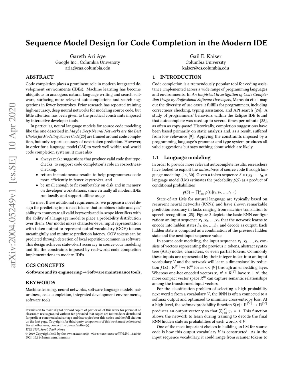 Code completion plays a prominent role in modern integrated development environments (IDEs). Machine learning has become ubiquitous in analogous natural language writing and search software, surfacing more relevant autocompletions and search suggestions in fewer keystrokes. Prior research has reported training high-accuracy, deep neural networks for modeling source code, but little attention has been given to the practical constraints imposed by interactive developer tools. In particular, neural language models for source code modeling like the one described in Maybe Deep Neural Networks are the Best Choice for Modeling Source Code are framed around code completion, but only report accuracy of next-token prediction. However, in order for a language model (LM) to work well within real-world code completion systems, it must also always make suggestions that produce valid code that typechecks to support code completion's role in correctness-checking; return instantaneous results to help programmers code more efficiently in fewer keystrokes; and be small enough to fit comfortably on disk and in memory on developer workstations, since virtually all modern IDEs run locally and support offline usage. To meet these additional requirements, we propose a novel design for predicting top-k next tokens that combines static analysis' ability to enumerate all valid keywords and in-scope identifiers with the ability of a language model to place a probability distribution over them. Our model mixes character-level input representation with token output to represent out-of-vocabulary (OOV) tokens meaningfully and minimize prediction latency. OOV tokens can be predicted through detection of local repetition common in software. This design achieves state-of-art accuracy in source code modeling and fits the constraints imposed by real-world code completion implementations in modern IDEs.