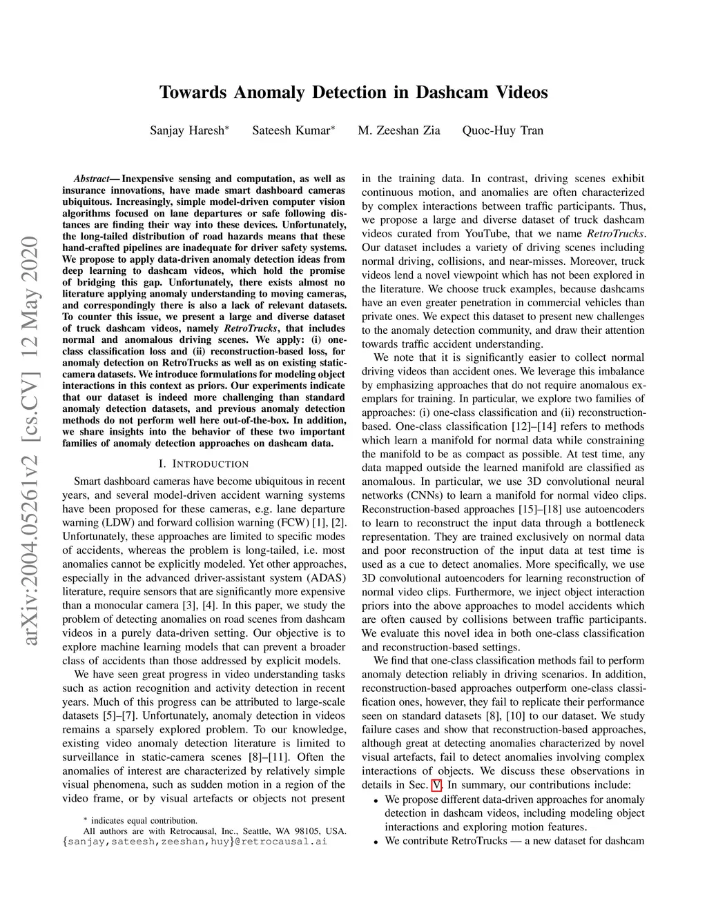 Inexpensive sensing and computation, as well as insurance innovations, have made smart dashboard cameras ubiquitous. Increasingly, simple model-driven computer vision algorithms focused on lane departures or safe following distances are finding their way into these devices. Unfortunately, the long-tailed distribution of road hazards means that these hand-crafted pipelines are inadequate for driver safety systems. We propose to apply data-driven anomaly detection ideas from deep learning to dashcam videos, which hold the promise of bridging this gap. Unfortunately, there exists almost no literature applying anomaly understanding to moving cameras, and correspondingly there is also a lack of relevant datasets. To counter this issue, we present a large and diverse dataset of truck dashcam videos, namely RetroTrucks, that includes normal and anomalous driving scenes. We apply: (i) one-class classification loss and (ii) reconstruction-based loss, for anomaly detection on RetroTrucks as well as on existing static-camera datasets. We introduce formulations for modeling object interactions in this context as priors. Our experiments indicate that our dataset is indeed more challenging than standard anomaly detection datasets, and previous anomaly detection methods do not perform well here out-of-the-box. In addition, we share insights into the behavior of these two important families of anomaly detection approaches on dashcam data.