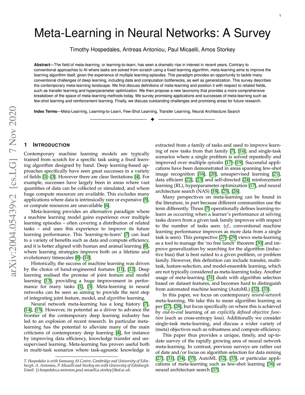 The field of meta-learning, or learning-to-learn, has seen a dramatic rise in interest in recent years. Contrary to conventional approaches to AI where tasks are solved from scratch using a fixed learning algorithm, meta-learning aims to improve the learning algorithm itself, given the experience of multiple learning episodes. This paradigm provides an opportunity to tackle many conventional challenges of deep learning, including data and computation bottlenecks, as well as generalization. This survey describes the contemporary meta-learning landscape. We first discuss definitions of meta-learning and position it with respect to related fields, such as transfer learning and hyperparameter optimization. We then propose a new taxonomy that provides a more comprehensive breakdown of the space of meta-learning methods today. We survey promising applications and successes of meta-learning such as few-shot learning and reinforcement learning. Finally, we discuss outstanding challenges and promising areas for future research.