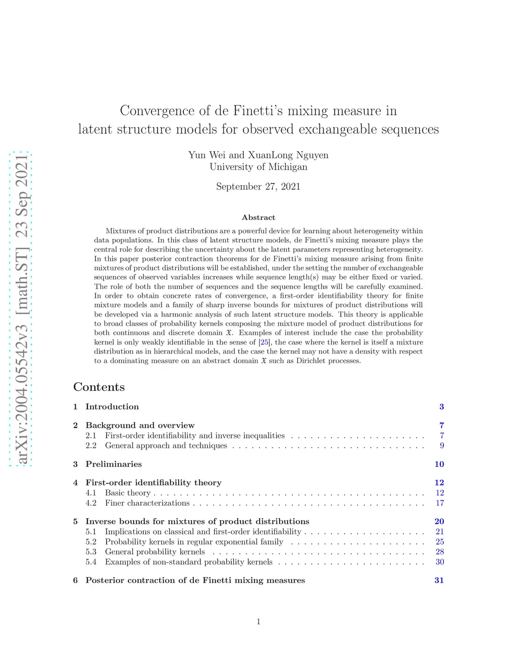 Mixtures of product distributions are a powerful device for learning about heterogeneity within data populations. In this class of latent structure models, de Finetti's mixing measure plays the central role for describing the uncertainty about the latent parameters representing heterogeneity. In this paper posterior contraction theorems for de Finetti's mixing measure arising from finite mixtures of product distributions will be established, under the setting the number of exchangeable sequences of observed variables increases while sequence length(s) may be either fixed or varied. The role of both the number of sequences and the sequence lengths will be carefully examined. In order to obtain concrete rates of convergence, a first-order identifiability theory for finite mixture models and a family of sharp inverse bounds for mixtures of product distributions will be developed via a harmonic analysis of such latent structure models. This theory is applicable to broad classes of probability kernels composing the mixture model of product distributions for both continuous and discrete domain . Examples of interest include the case the probability kernel is only weakly identifiable in the sense of Ho and Nguyen (2016), the case where the kernel is itself a mixture distribution as in hierarchical models, and the case the kernel may not have a density with respect to a dominating measure on an abstract domain such as Dirichlet processes.