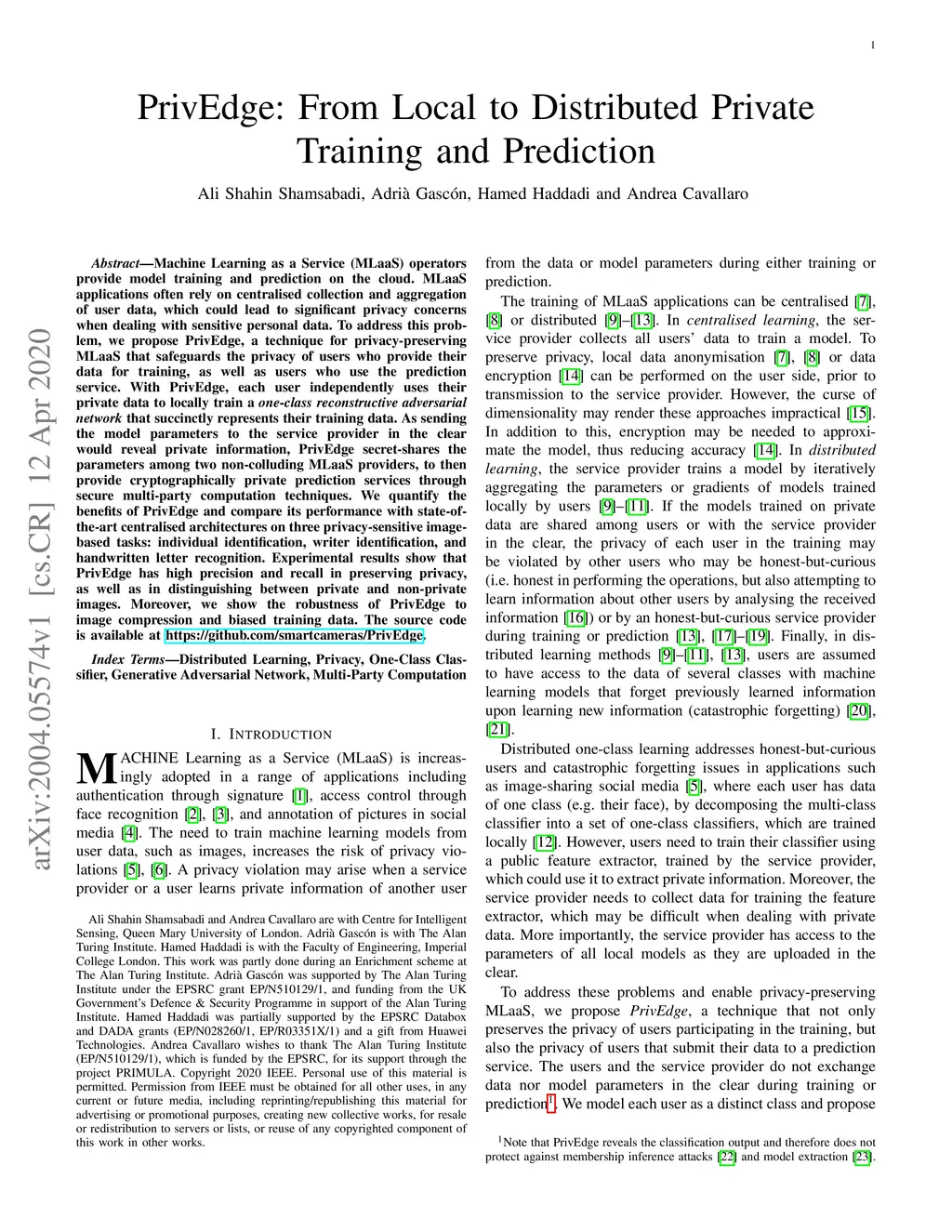 Machine Learning as a Service (MLaaS) operators provide model training and prediction on the cloud. MLaaS applications often rely on centralised collection and aggregation of user data, which could lead to significant privacy concerns when dealing with sensitive personal data. To address this problem, we propose PrivEdge, a technique for privacy-preserving MLaaS that safeguards the privacy of users who provide their data for training, as well as users who use the prediction service. With PrivEdge, each user independently uses their private data to locally train a one-class reconstructive adversarial network that succinctly represents their training data. As sending the model parameters to the service provider in the clear would reveal private information, PrivEdge secret-shares the parameters among two non-colluding MLaaS providers, to then provide cryptographically private prediction services through secure multi-party computation techniques. We quantify the benefits of PrivEdge and compare its performance with state-of-the-art centralised architectures on three privacy-sensitive image-based tasks: individual identification, writer identification, and handwritten letter recognition. Experimental results show that PrivEdge has high precision and recall in preserving privacy, as well as in distinguishing between private and non-private images. Moreover, we show the robustness of PrivEdge to image compression and biased training data. The source code is available at https://github.com/smartcameras/PrivEdge.