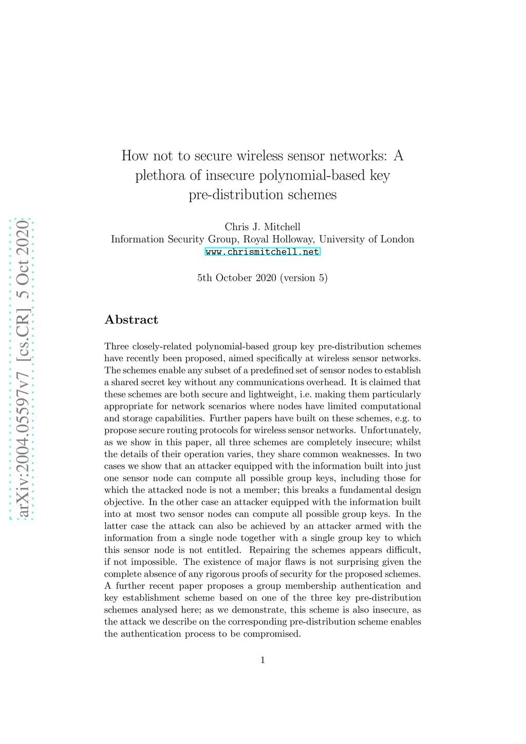 Three closely-related polynomial-based group key pre-distribution schemes have recently been proposed, aimed specifically at wireless sensor networks. The schemes enable any subset of a predefined set of sensor nodes to establish a shared secret key without any communications overhead. It is claimed that these schemes are both secure and lightweight, i.e. making them particularly appropriate for network scenarios where nodes have limited computational and storage capabilities. Further papers have built on these schemes, e.g. to propose secure routing protocols for wireless sensor networks. Unfortunately, as we show in this paper, all three schemes are completely insecure; whilst the details of their operation varies, they share common weaknesses. In every case we show that an attacker equipped with the information built into at most two sensor nodes can compute group keys for all possible groups of which the attacked nodes are not a member, which breaks a fundamental design objective. The attacks can also be achieved by an attacker armed with the information from a single node together with a single group key to which this sensor node is not entitled. Repairing the schemes appears difficult, if not impossible. The existence of major flaws is not surprising given the complete absence of any rigorous proofs of security for the proposed schemes. A further recent paper proposes a group membership authentication and key establishment scheme based on one of the three key pre-distribution schemes analysed here; as we demonstrate, this scheme is also insecure, as the attack we describe on the corresponding pre-distribution scheme enables the authentication process to be compromised.
