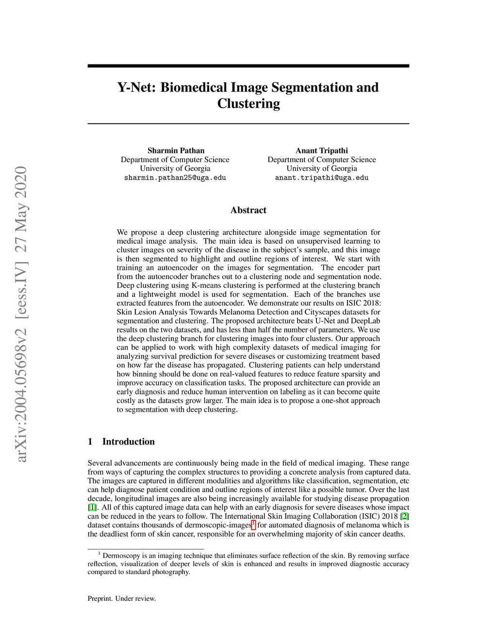We propose a deep clustering architecture alongside image segmentation for medical image analysis. The main idea is based on unsupervised learning to cluster images on severity of the disease in the subject's sample, and this image is then segmented to highlight and outline regions of interest. We start with training an autoencoder on the images for segmentation. The encoder part from the autoencoder branches out to a clustering node and segmentation node. Deep clustering using Kmeans clustering is performed at the clustering branch and a lightweight model is used for segmentation. Each of the branches use extracted features from the autoencoder. We demonstrate our results on ISIC 2018 Skin Lesion Analysis Towards Melanoma Detection and Cityscapes datasets for segmentation and clustering. The proposed architecture beats UNet and DeepLab results on the two datasets, and has less than half the number of parameters. We use the deep clustering branch for clustering images into four clusters. Our approach can be applied to work with high complexity datasets of medical imaging for analyzing survival prediction for severe diseases or customizing treatment based on how far the disease has propagated. Clustering patients can help understand how binning should be done on real valued features to reduce feature sparsity and improve accuracy on classification tasks. The proposed architecture can provide an early diagnosis and reduce human intervention on labeling as it can become quite costly as the datasets grow larger. The main idea is to propose a one shot approach to segmentation with deep clustering.