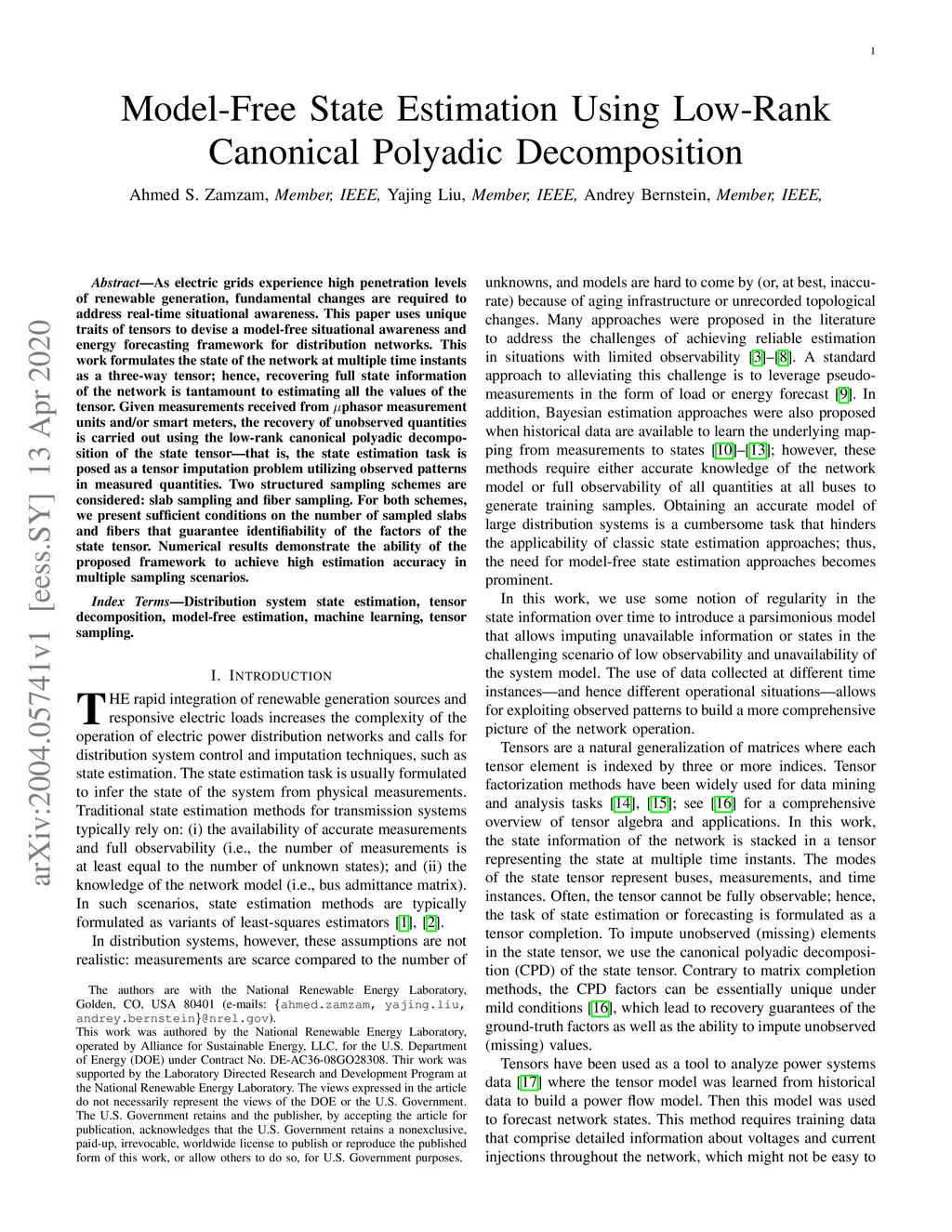 As electric grids experience high penetration levels of renewable generation, fundamental changes are required to address real-time situational awareness. This paper uses unique traits of tensors to devise a model-free situational awareness and energy forecasting framework for distribution networks. This work formulates the state of the network at multiple time instants as a three-way tensor; hence, recovering full state information of the network is tantamount to estimating all the values of the tensor. Given measurements received from phasor measurement units and/or smart meters, the recovery of unobserved quantities is carried out using the low-rank canonical polyadic decomposition of the state tensor---that is, the state estimation task is posed as a tensor imputation problem utilizing observed patterns in measured quantities. Two structured sampling schemes are considered: slab sampling and fiber sampling. For both schemes, we present sufficient conditions on the number of sampled slabs and fibers that guarantee identifiability of the factors of the state tensor. Numerical results demonstrate the ability of the proposed framework to achieve high estimation accuracy in multiple sampling scenarios.