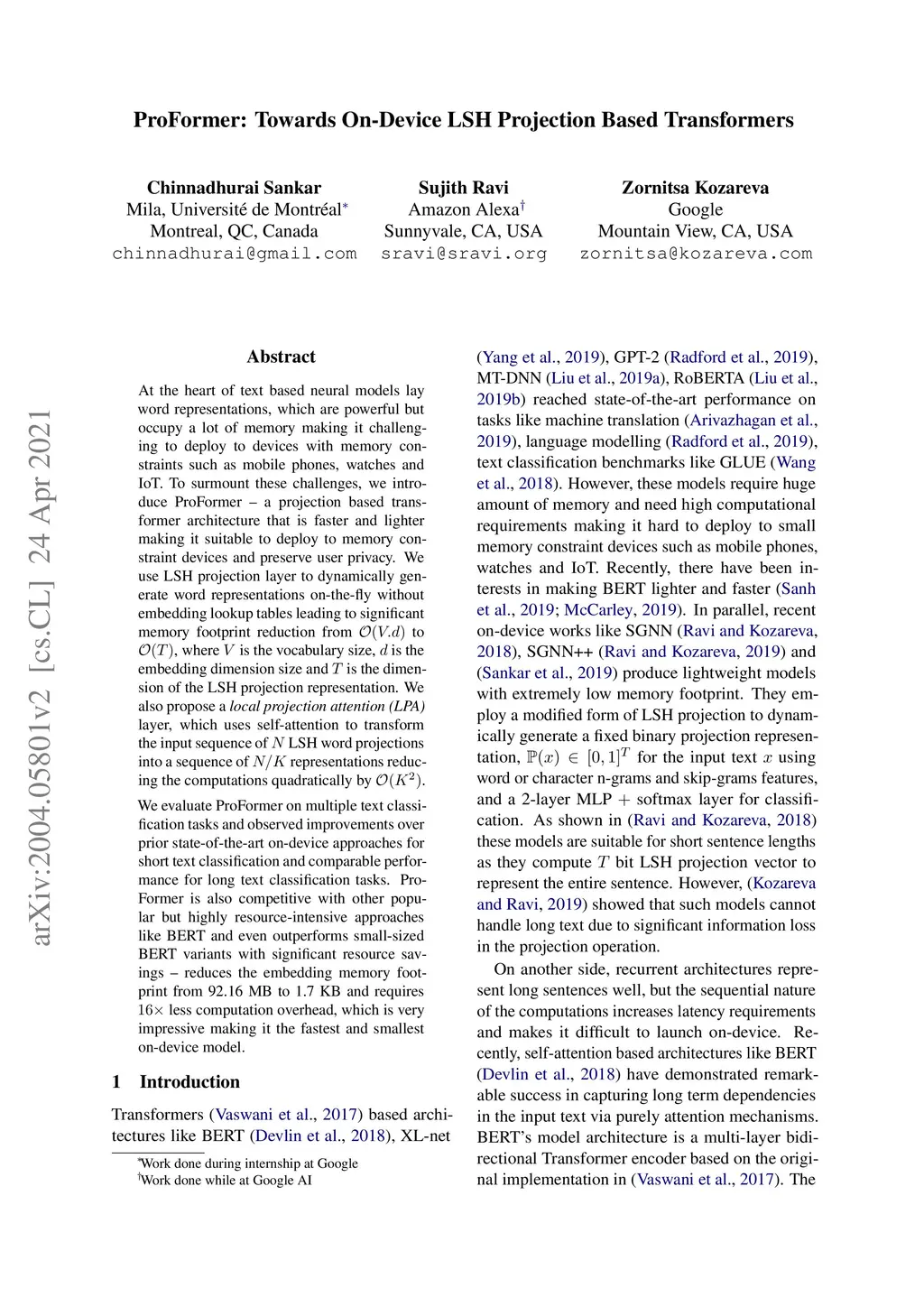 ProFormer: Towards On-Device LSH Projection Based Transformers