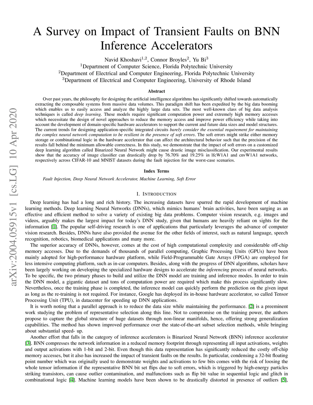 Over past years, the philosophy for designing the artificial intelligence algorithms has significantly shifted towards automatically extracting the composable systems from massive data volumes. This paradigm shift has been expedited by the big data booming which enables us to easily access and analyze the highly large data sets. The most well-known class of big data analysis techniques is called deep learning. These models require significant computation power and extremely high memory accesses which necessitate the design of novel approaches to reduce the memory access and improve power efficiency while taking into account the development of domain-specific hardware accelerators to support the current and future data sizes and model structures.The current trends for designing application-specific integrated circuits barely consider the essential requirement for maintaining the complex neural network computation to be resilient in the presence of soft errors. The soft errors might strike either memory storage or combinational logic in the hardware accelerator that can affect the architectural behavior such that the precision of the results fall behind the minimum allowable correctness. In this study, we demonstrate that the impact of soft errors on a customized deep learning algorithm called Binarized Neural Network might cause drastic image misclassification. Our experimental results show that the accuracy of image classifier can drastically drop by 76.70% and 19.25% in lfcW1A1 and cnvW1A1 networks,respectively across CIFAR-10 and MNIST datasets during the fault injection for the worst-case scenarios