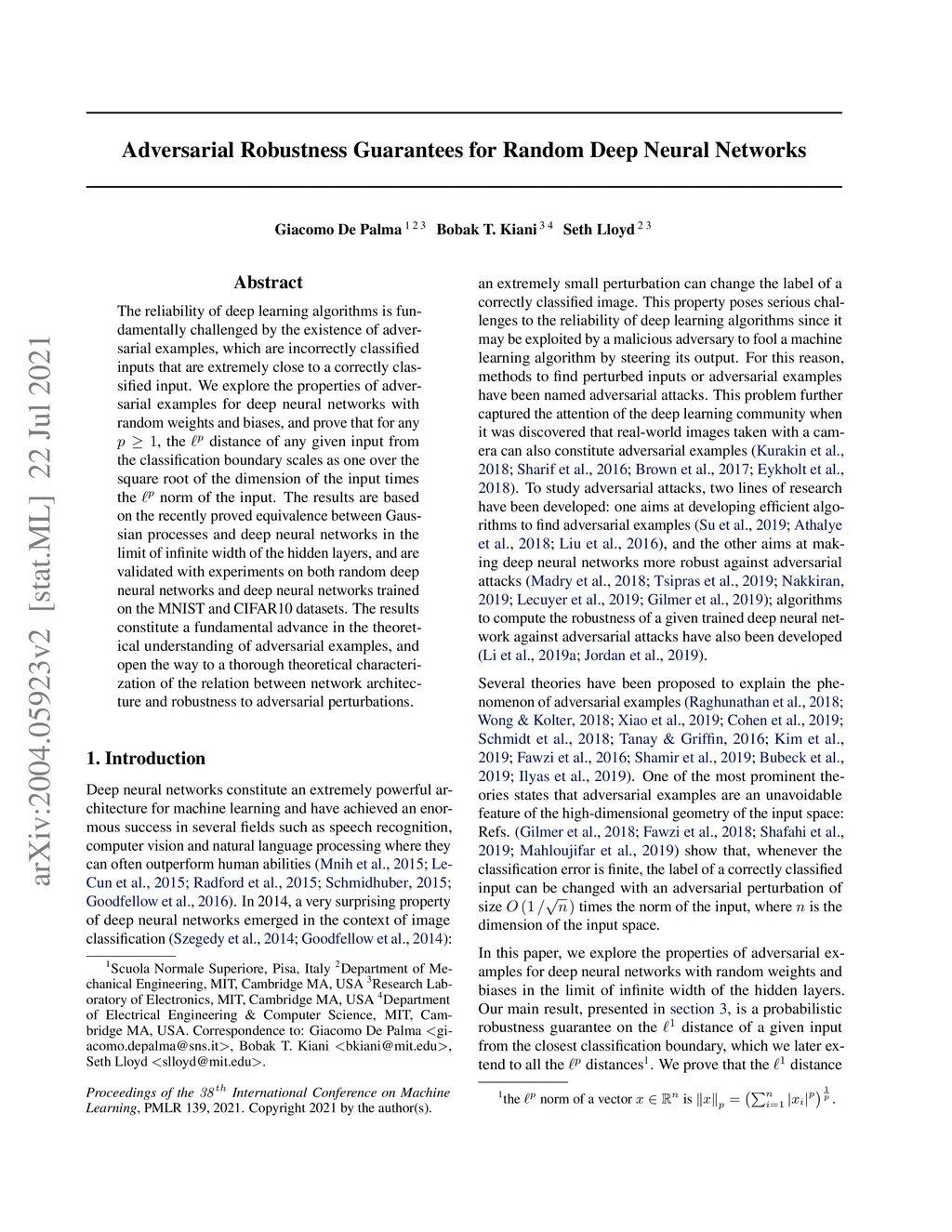 The reliability of deep learning algorithms is fundamentally challenged by the existence of adversarial examples, which are incorrectly classified inputs that are extremely close to a correctly classified input. We explore the properties of adversarial examples for deep neural networks with random weights and biases, and prove that for any , the distance of any given input from the classification boundary scales as one over the square root of the dimension of the input times the norm of the input. The results are based on the recently proved equivalence between Gaussian processes and deep neural networks in the limit of infinite width of the hidden layers, and are validated with experiments on both random deep neural networks and deep neural networks trained on the MNIST and CIFAR10 datasets. The results constitute a fundamental advance in the theoretical understanding of adversarial examples, and open the way to a thorough theoretical characterization of the relation between network architecture and robustness to adversarial perturbations.