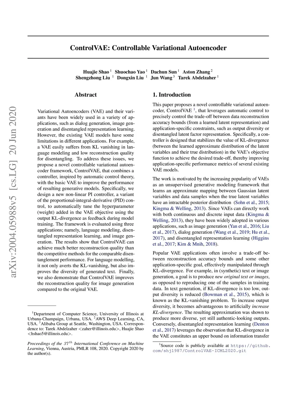 Variational Autoencoders (VAE) and their variants have been widely used in a variety of applications, such as dialog generation, image generation and disentangled representation learning. However, the existing VAE models have some limitations in different applications. For example, a VAE easily suffers from KL vanishing in language modeling and low reconstruction quality for disentangling. To address these issues, we propose a novel controllable variational autoencoder framework, ControlVAE, that combines a controller, inspired by automatic control theory, with the basic VAE to improve the performance of resulting generative models. Specifically, we design a new non-linear PI controller, a variant of the proportional-integral-derivative (PID) control, to automatically tune the hyperparameter (weight) added in the VAE objective using the output KL-divergence as feedback during model training. The framework is evaluated using three applications; namely, language modeling, disentangled representation learning, and image generation. The results show that ControlVAE can achieve better disentangling and reconstruction quality than the existing methods. For language modelling, it not only averts the KL-vanishing, but also improves the diversity of generated text. Finally, we also demonstrate that ControlVAE improves the reconstruction quality of generated images compared to the original VAE.