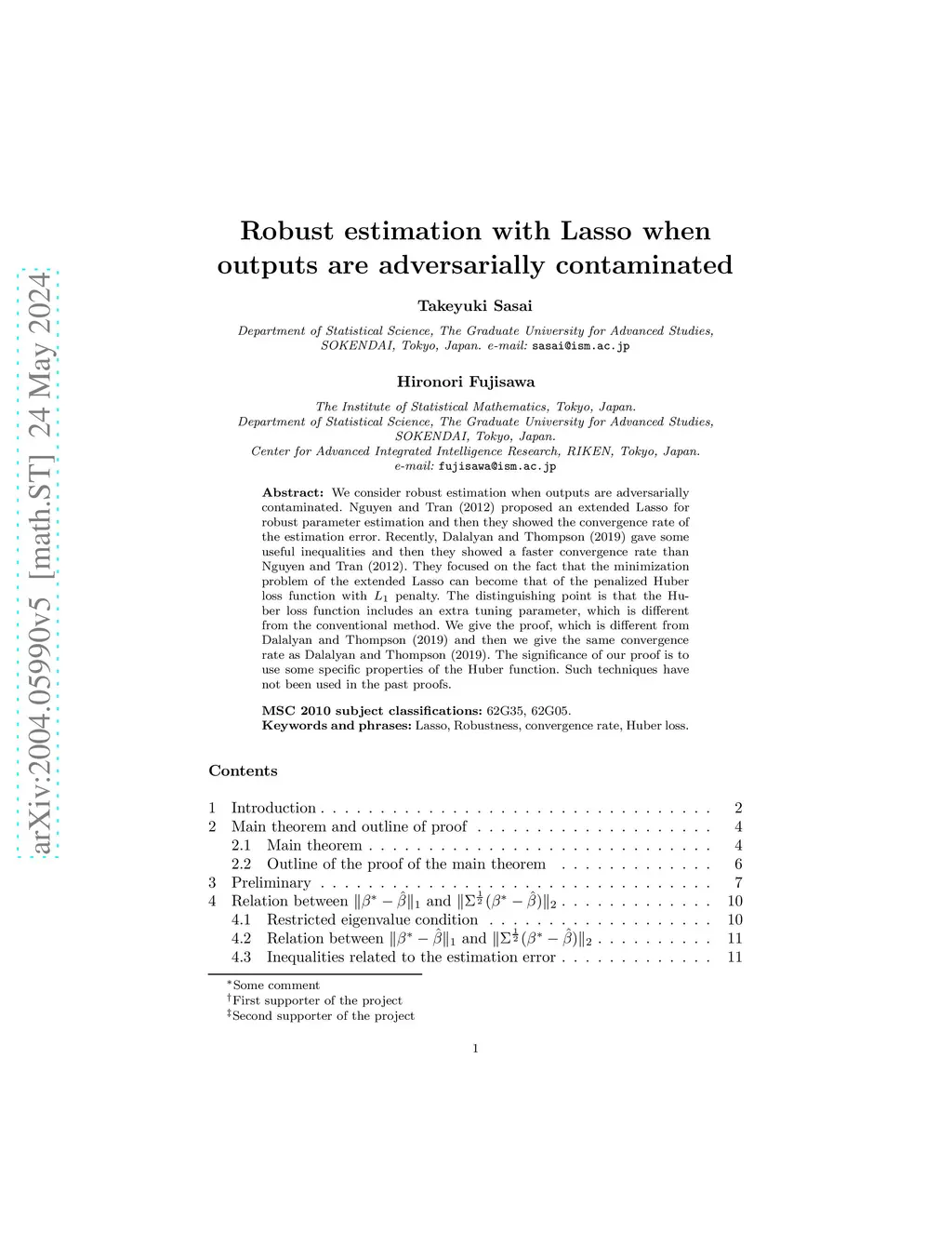 We consider robust estimation when outputs are adversarially contaminated. Nguyen and Tran (2012) proposed an extended Lasso for robust parameter estimation and then they showed the convergence rate of the estimation error. Recently, Dalalyan and Thompson (2019) gave some useful inequalities and then they showed a faster convergence rate than Nguyen and Tran (2012). They focused on the fact that the minimization problem of the extended Lasso can become that of the penalized Huber loss function with penalty. The distinguishing point is that the Huber loss function includes an extra tuning parameter, which is different from the conventional method. We give the proof, which is different from Dalalyan and Thompson (2019) and then we give the same convergence rate as Dalalyan and Thompson (2019). The significance of our proof is to use some specific properties of the Huber function. Such techniques have not been used in the past proofs.