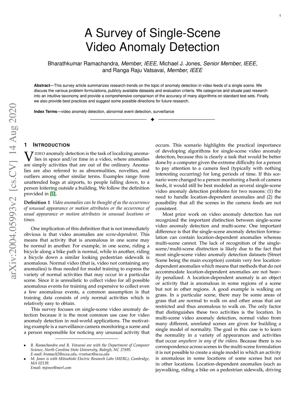This survey article summarizes research trends on the topic of anomaly detection in video feeds of a single scene. We discuss the various problem formulations, publicly available datasets and evaluation criteria. We categorize and situate past research into an intuitive taxonomy and provide a comprehensive comparison of the accuracy of many algorithms on standard test sets. Finally, we also provide best practices and suggest some possible directions for future research.