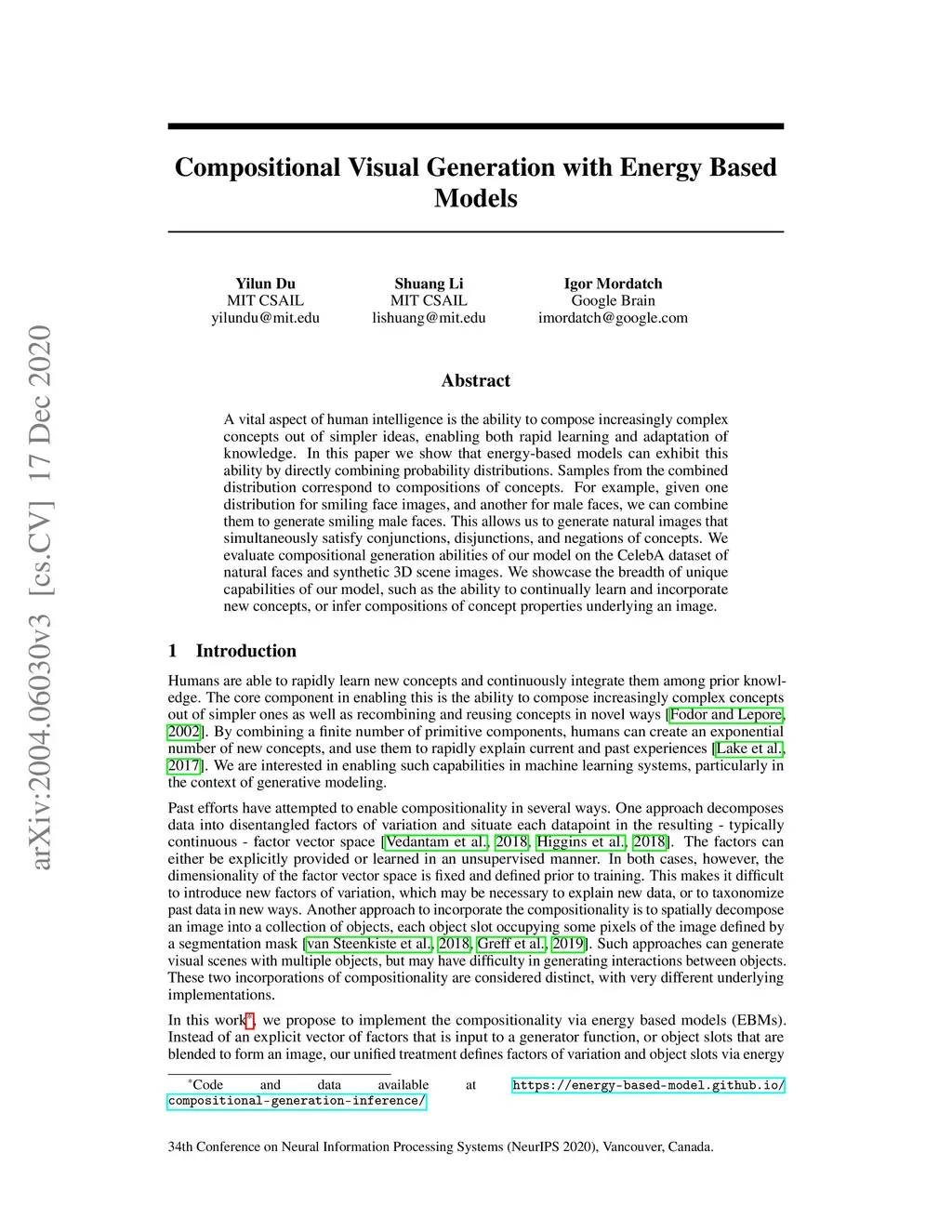 A vital aspect of human intelligence is the ability to compose increasingly complex concepts out of simpler ideas, enabling both rapid learning and adaptation of knowledge. In this paper we show that energy-based models can exhibit this ability by directly combining probability distributions. Samples from the combined distribution correspond to compositions of concepts. For example, given a distribution for smiling faces, and another for male faces, we can combine them to generate smiling male faces. This allows us to generate natural images that simultaneously satisfy conjunctions, disjunctions, and negations of concepts. We evaluate compositional generation abilities of our model on the CelebA dataset of natural faces and synthetic 3D scene images. We also demonstrate other unique advantages of our model, such as the ability to continually learn and incorporate new concepts, or infer compositions of concept properties underlying an image.