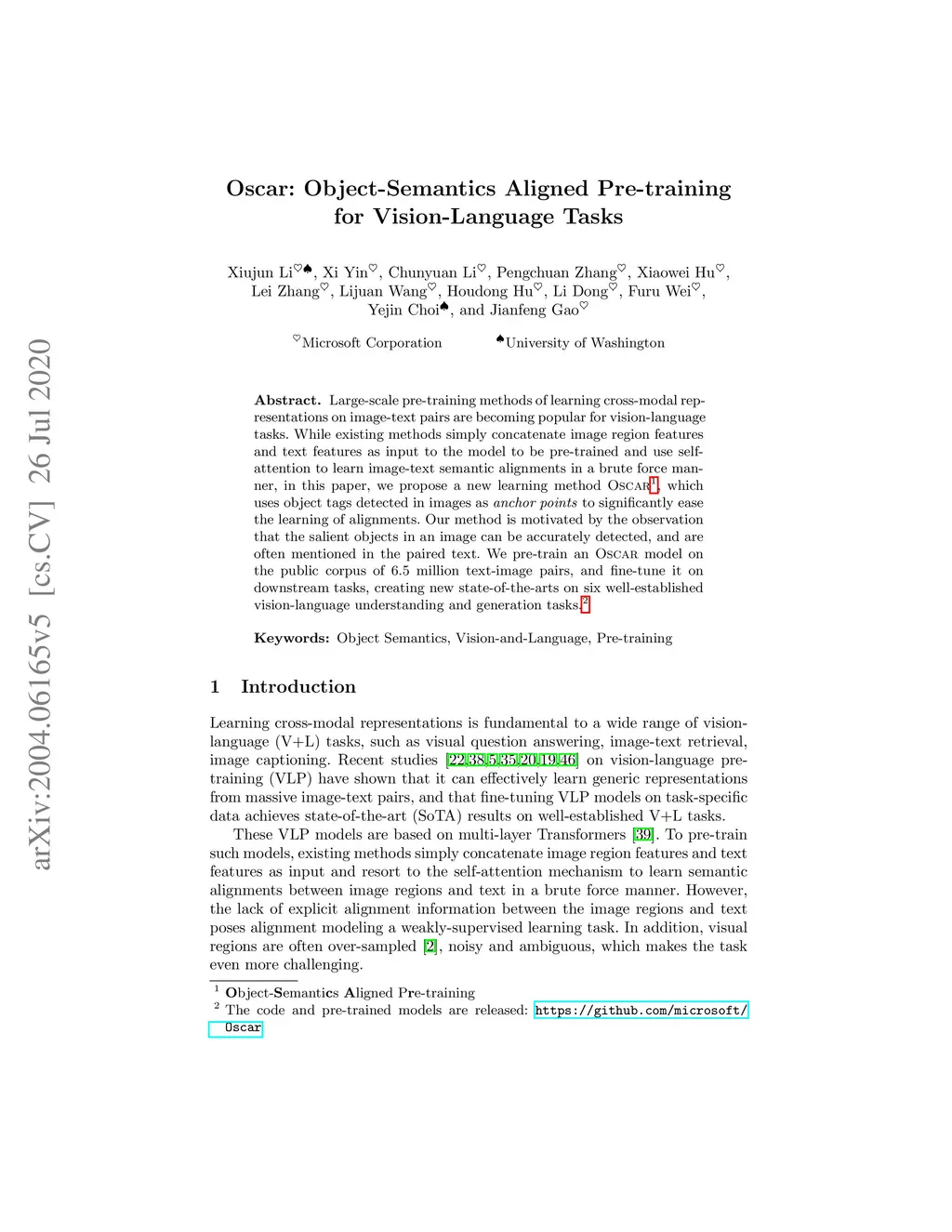 Oscar: Object-Semantics Aligned Pre-training for Vision-Language Tasks