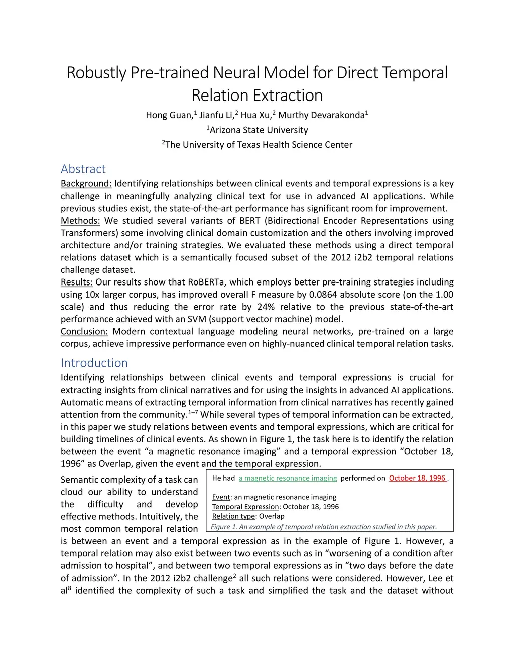 Background: Identifying relationships between clinical events and temporal expressions is a key challenge in meaningfully analyzing clinical text for use in advanced AI applications. While previous studies exist, the state-of-the-art performance has significant room for improvement. Methods: We studied several variants of BERT (Bidirectional Encoder Representations using Transformers) some involving clinical domain customization and the others involving improved architecture and/or training strategies. We evaluated these methods using a direct temporal relations dataset which is a semantically focused subset of the 2012 i2b2 temporal relations challenge dataset. Results: Our results show that RoBERTa, which employs better pre-training strategies including using 10x larger corpus, has improved overall F measure by 0.0864 absolute score (on the 1.00 scale) and thus reducing the error rate by 24% relative to the previous state-of-the-art performance achieved with an SVM (support vector machine) model. Conclusion: Modern contextual language modeling neural networks, pre-trained on a large corpus, achieve impressive performance even on highly-nuanced clinical temporal relation tasks.