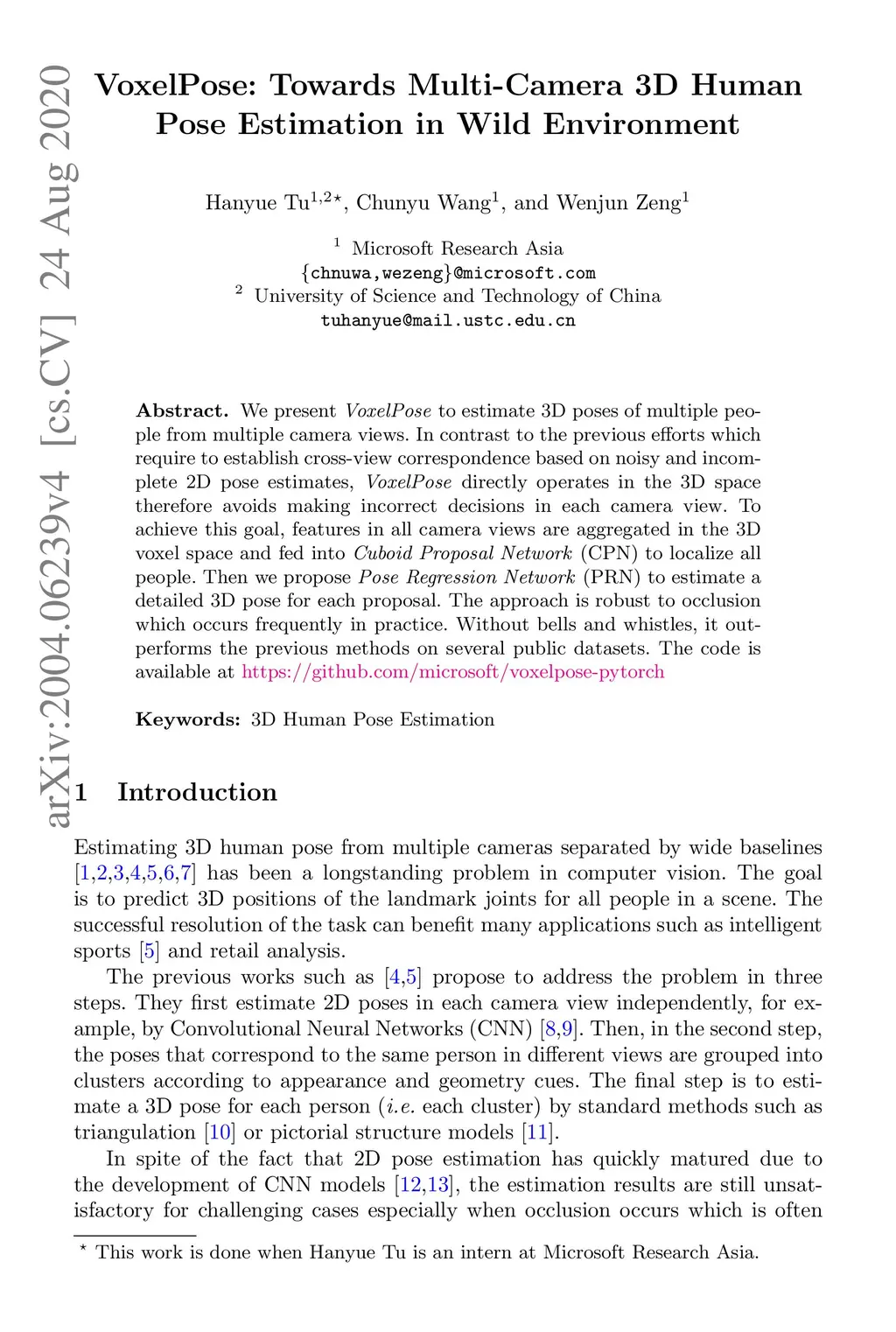 We present an approach to estimate 3D poses of multiple people from multiple camera views. In contrast to the previous efforts which require to establish cross-view correspondence based on noisy and incomplete 2D pose estimations, we present an end-to-end solution which directly operates in the D space, therefore avoids making incorrect decisions in the 2D space. To achieve this goal, the features in all camera views are warped and aggregated in a common 3D space, and fed into Cuboid Proposal Network (CPN) to coarsely localize all people. Then we propose Pose Regression Network (PRN) to estimate a detailed 3D pose for each proposal. The approach is robust to occlusion which occurs frequently in practice. Without bells and whistles, it outperforms the state-of-the-arts on the public datasets. Code will be released at https://github.com/microsoft/multiperson-pose-estimation-pytorch.