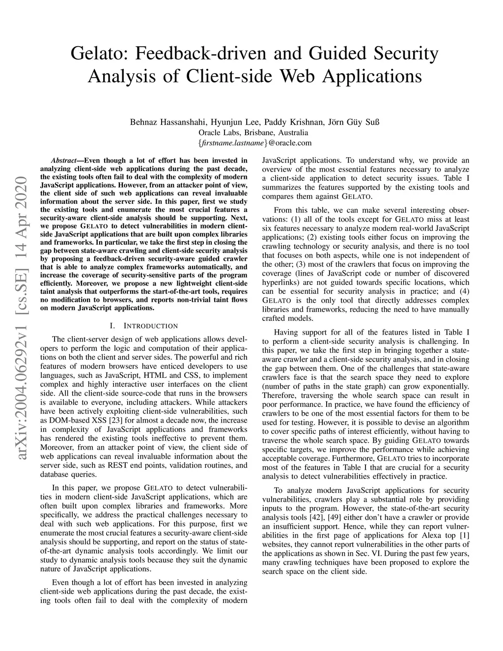 Even though a lot of effort has been invested in analyzing client-side web applications during the past decade, the existing tools often fail to deal with the complexity of modern JavaScript applications. However, from an attacker point of view, the client side of such web applications can reveal invaluable information about the server side. In this paper, first we study the existing tools and enumerate the most crucial features a security-aware client-side analysis should be supporting. Next, we propose GELATO to detect vulnerabilities in modern client-side JavaScript applications that are built upon complex libraries and frameworks. In particular, we take the first step in closing the gap between state-aware crawling and client-side security analysis by proposing a feedback-driven security-aware guided crawler that is able to analyze complex frameworks automatically, and increase the coverage of security-sensitive parts of the program efficiently. Moreover, we propose a new lightweight client-side taint analysis that outperforms the start-of-the-art tools, requires no modification to browsers, and reports non-trivial taint flows on modern JavaScript applications.