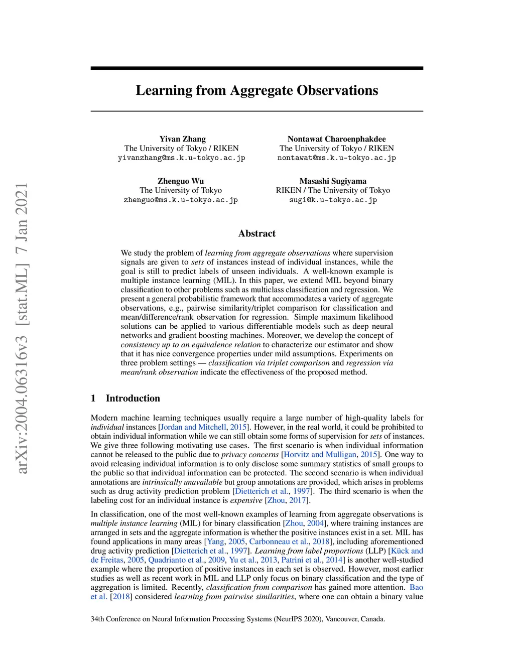 We study the problem of learning from aggregate observations where supervision signals are given to sets of instances instead of individual instances, while the goal is still to predict labels of unseen individuals. A well-known example is multiple instance learning (MIL). In this paper, we extend MIL beyond binary classification to other problems such as multiclass classification and regression. We present a general probabilistic framework that accommodates a variety of aggregate observations, e.g., pairwise similarity/triplet comparison for classification and mean/difference/rank observation for regression. Simple maximum likelihood solutions can be applied to various differentiable models such as deep neural networks and gradient boosting machines. Moreover, we develop the concept of consistency up to an equivalence relation to characterize our estimator and show that it has nice convergence properties under mild assumptions. Experiments on three problem settings -- classification via triplet comparison and regression via mean/rank observation indicate the effectiveness of the proposed method.