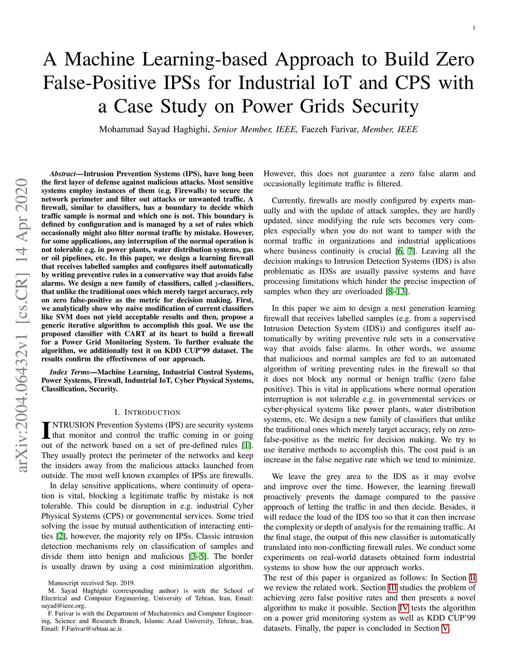 Intrusion Prevention Systems (IPS), have long been the first layer of defense against malicious attacks. Most sensitive systems employ instances of them (e.g. Firewalls) to secure the network perimeter and filter out attacks or unwanted traffic. A firewall, similar to classifiers, has a boundary to decide which traffic sample is normal and which one is not. This boundary is defined by configuration and is managed by a set of rules which occasionally might also filter normal traffic by mistake. However, for some applications, any interruption of the normal operation is not tolerable e.g. in power plants, water distribution systems, gas or oil pipelines, etc. In this paper, we design a learning firewall that receives labelled samples and configures itself automatically by writing preventive rules in a conservative way that avoids false alarms. We design a new family of classifiers, called -classifiers, that unlike the traditional ones which merely target accuracy, rely on zero false-positive as the metric for decision making. First, we analytically show why naive modification of current classifiers like SVM does not yield acceptable results and then, propose a generic iterative algorithm to accomplish this goal. We use the proposed classifier with CART at its heart to build a firewall for a Power Grid Monitoring System. To further evaluate the algorithm, we additionally test it on KDD CUP'99 dataset. The results confirm the effectiveness of our approach.
